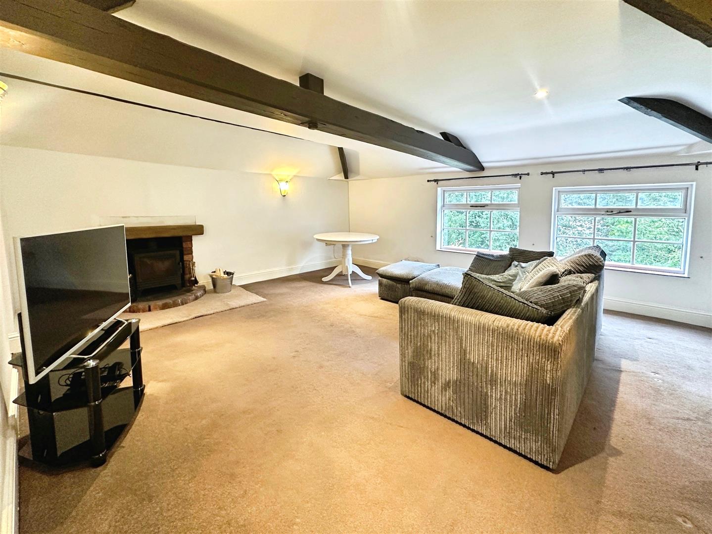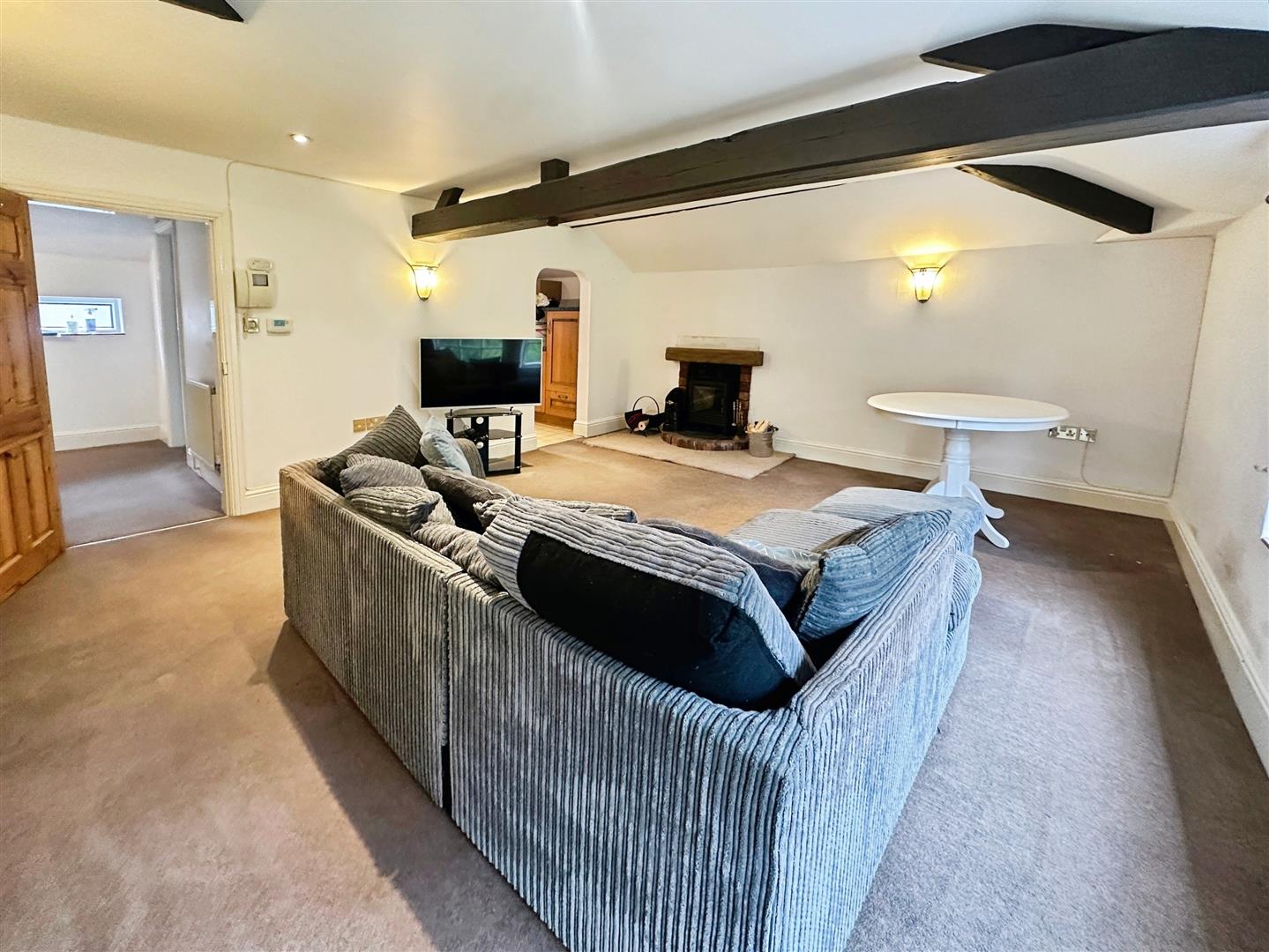 Spacious room with space for living and dining furniture. Includes sofa, TV stand and table. Feature fireplace with wood burner. Two windows. Please note this room has low ceiling beams.