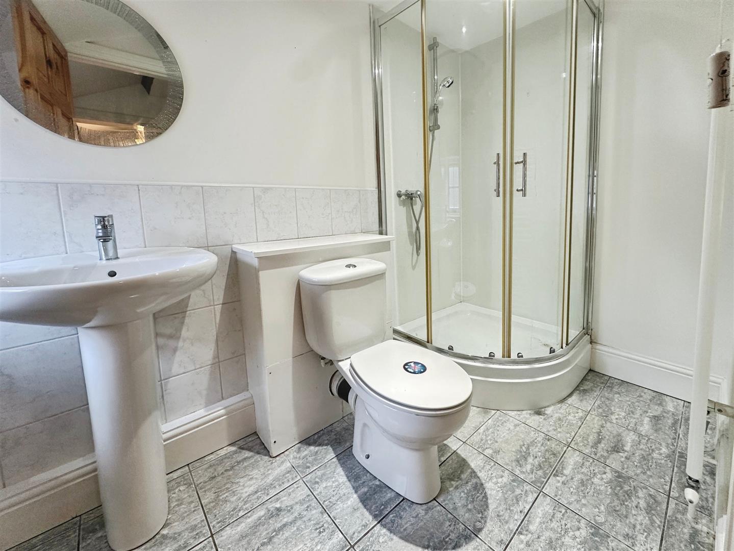 Tiled flooring with partially tiled walls. Suite comprising shower cubicle with thermostatic shower, push-button WC, and pedestal wash hand basin. White radiator.