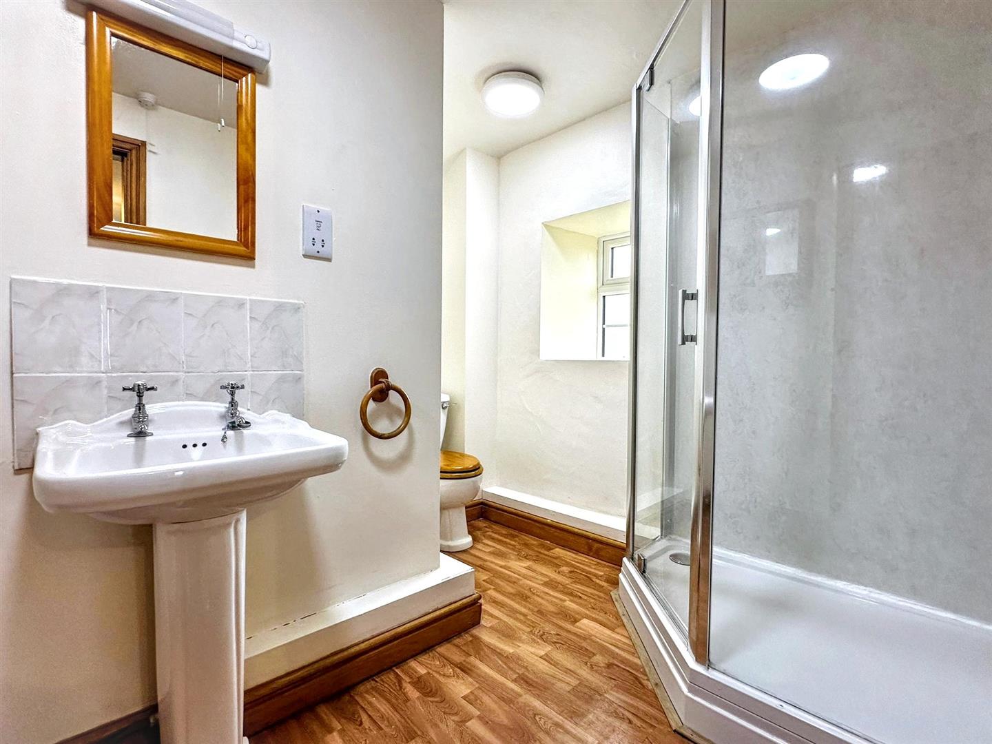 Wooden flooring. Pedestal style wash hand basin. WC. Shower cubicle. uPVC window. Ceiling light.