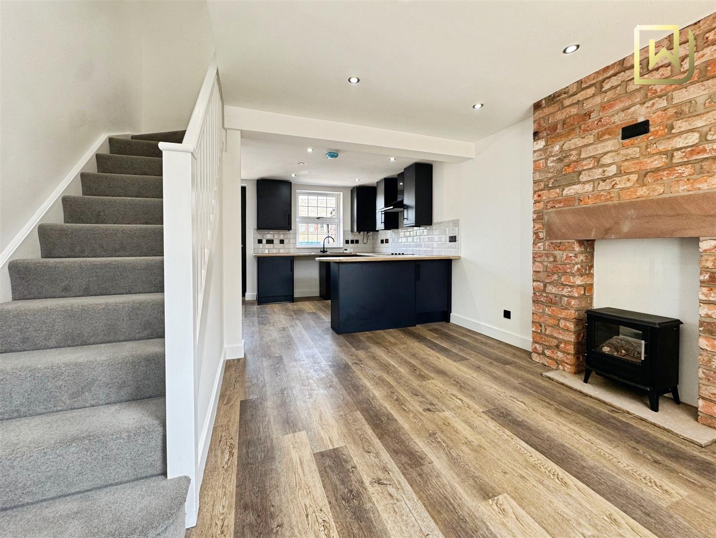 Wooden design flooring. Wall mounted radiator. UPVC double glazed window to the front aspect. Brick fireplace. Electric log burner fire. Open Plan access into kitchen. Stairs leading to 1st floor accommodation. Inset spotlights.