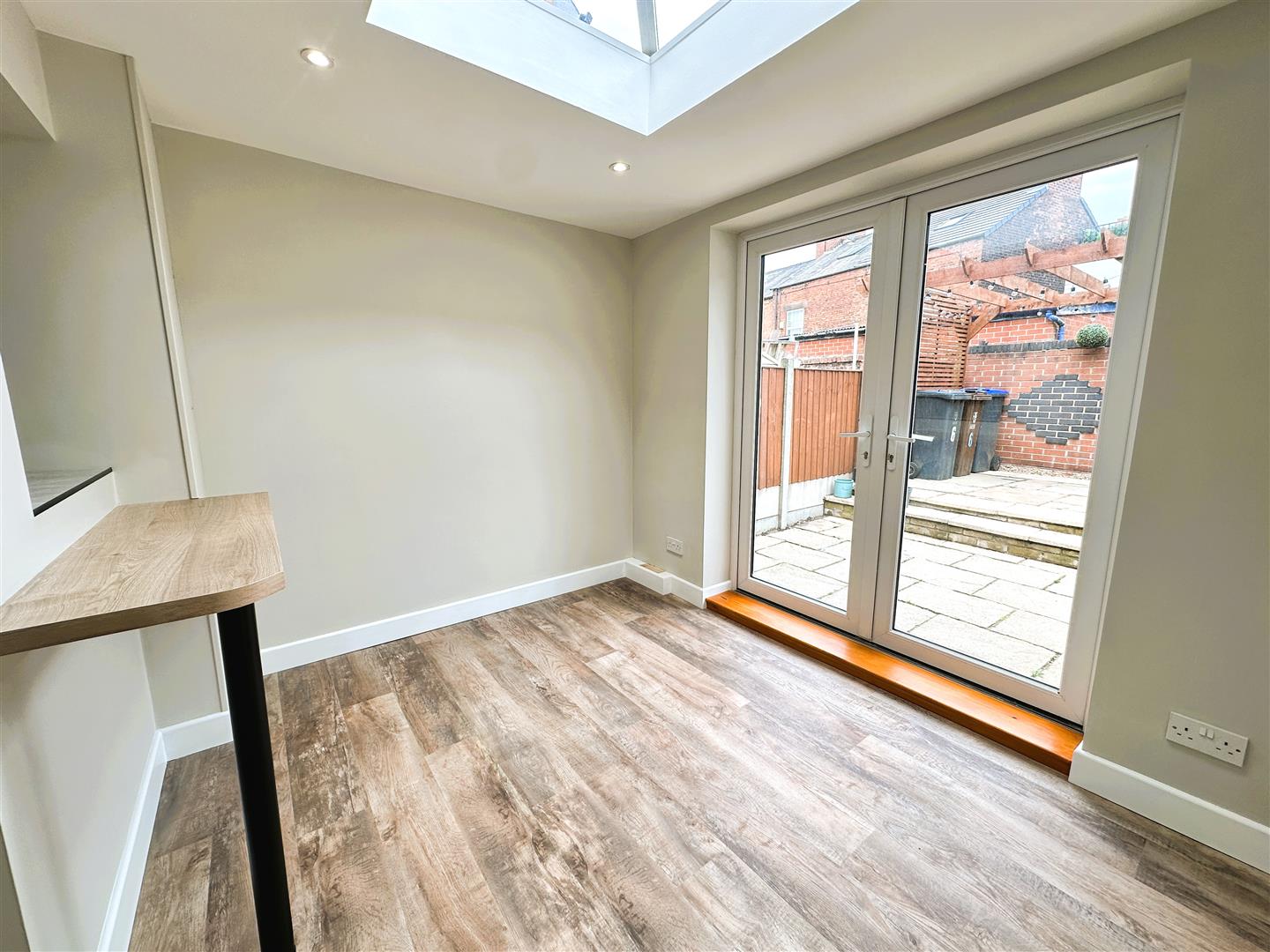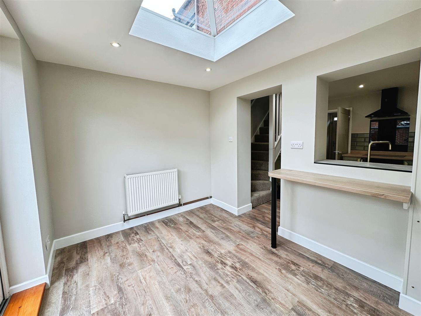 Light-filled area with patio doors to the garden, a striking roof lantern above, and useful worktop space. Gas central heating radiator.
