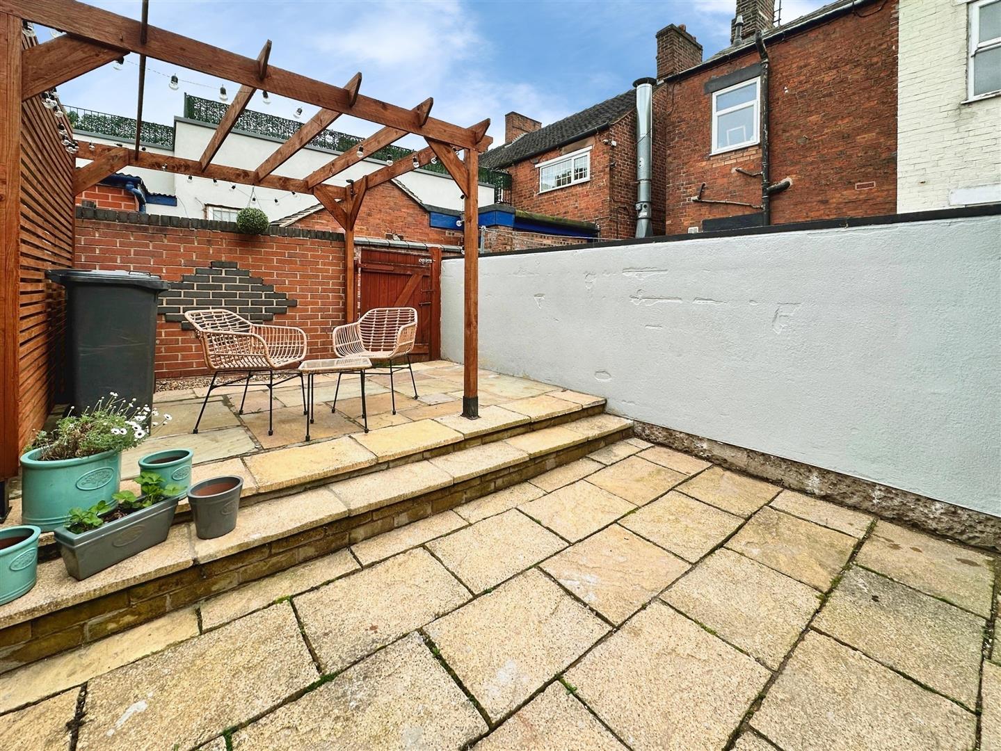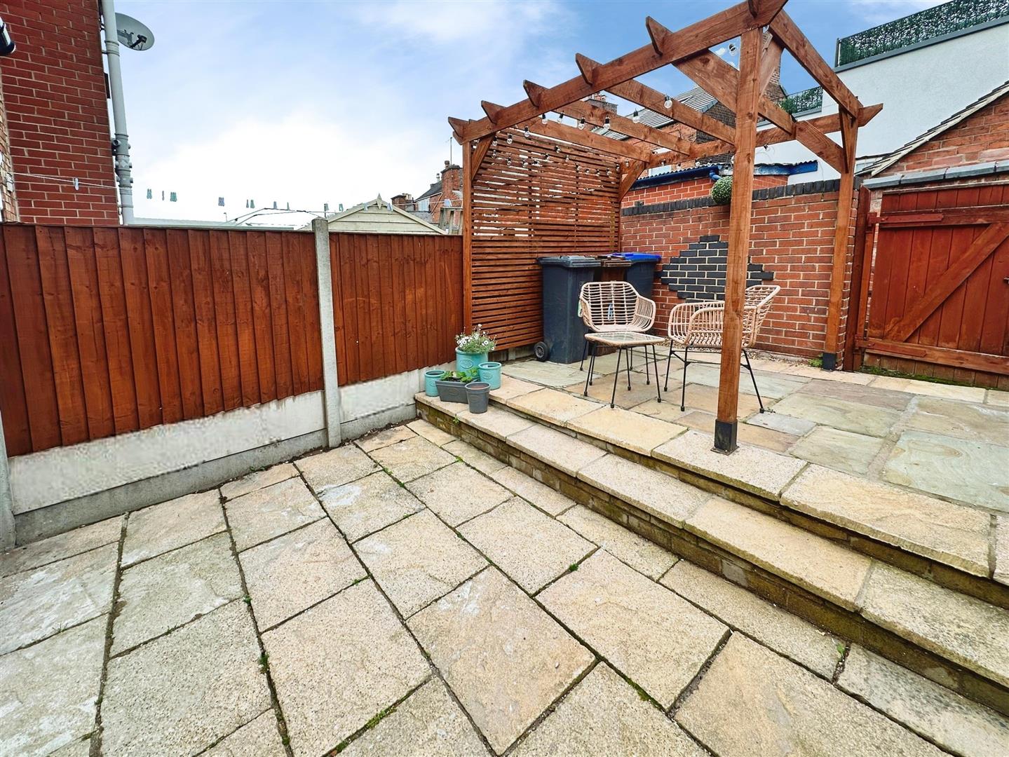 To the rear is a private enclosed rear garden featuring an Indian stone patio, wooden pergola, and rear gate access.