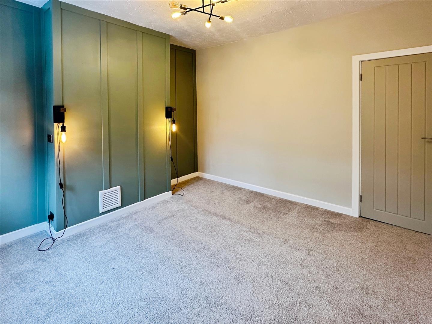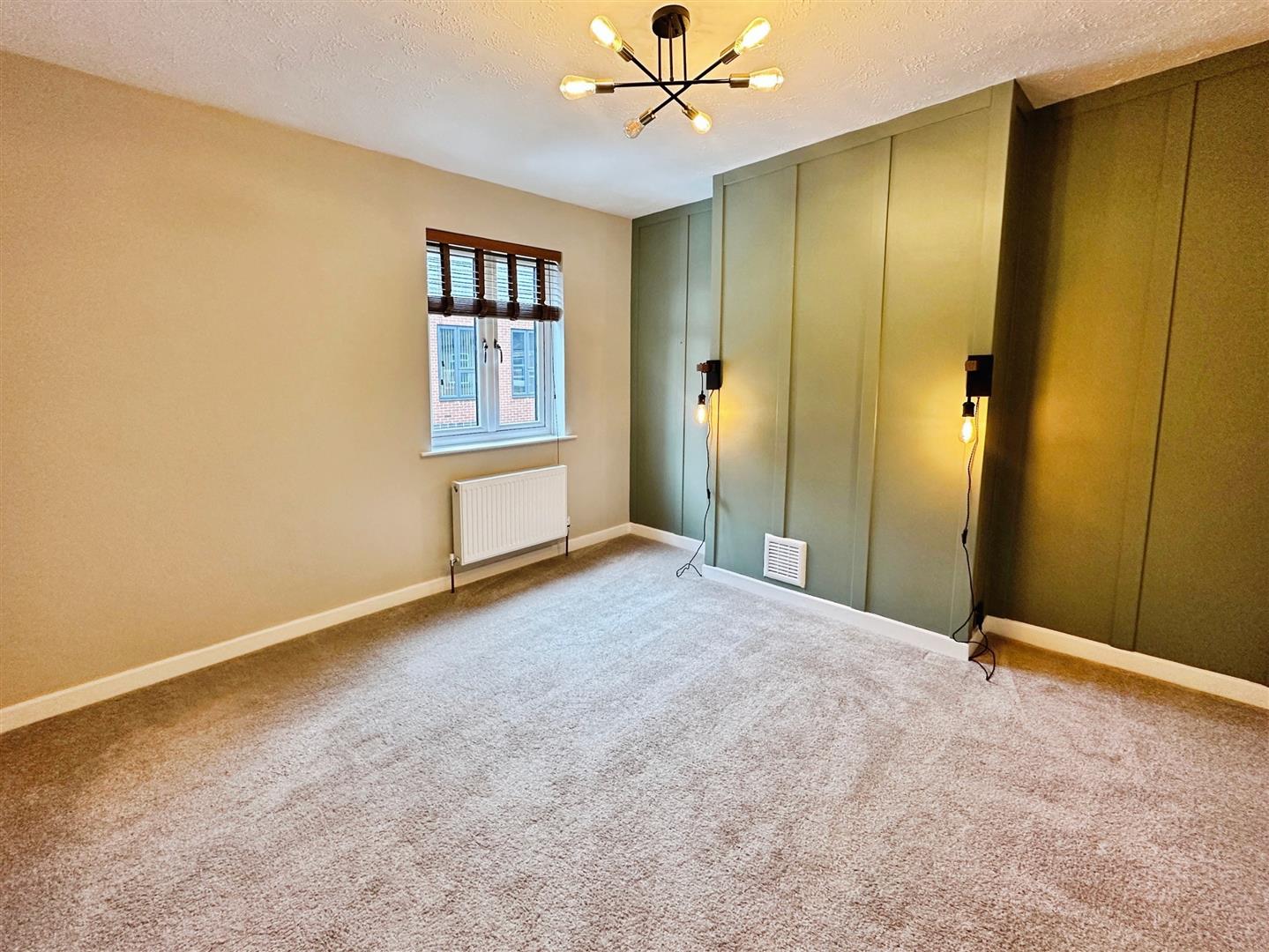 Well-presented double bedroom with carpeted floor, neutral decor with a stylish panelled feature wall. Double-glazed window and gas central heating radiator.