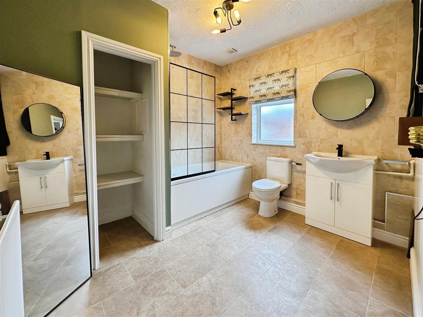 Partially tiled bathroom with white suite comprising bath with thermostatic shower over and sleek glass screen, wash hand basin with vanity unit, WC, and built in storage cupboards.