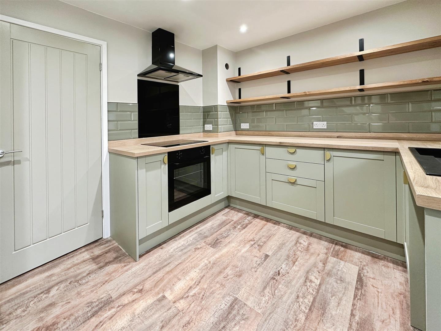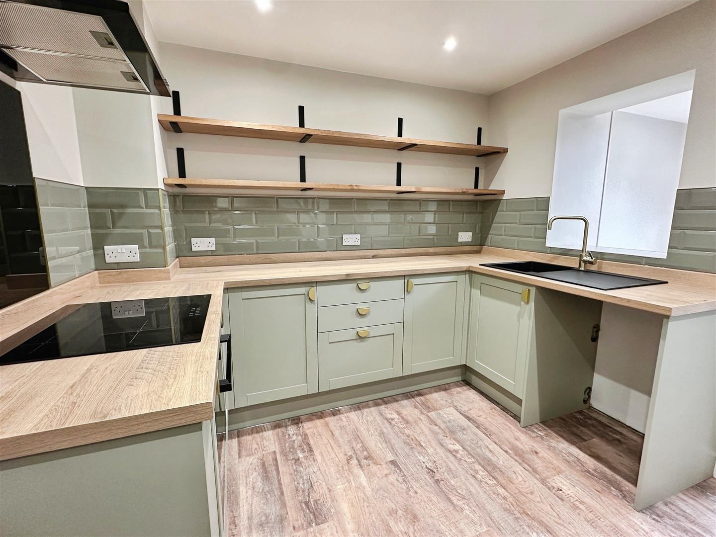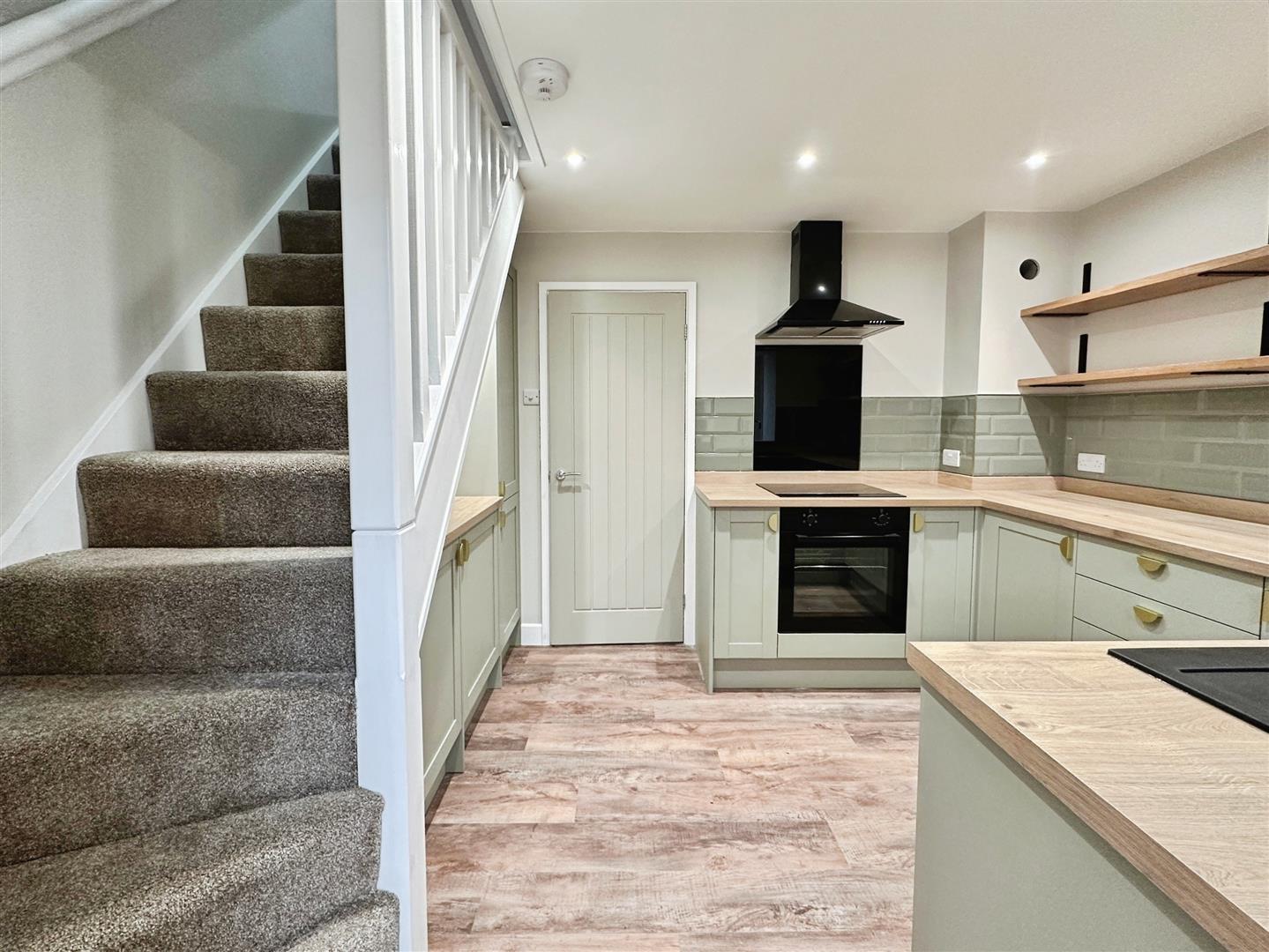 Stylish fitted kitchen with a range of base units, open shelving, an integrated electric oven and hob, and black cooker hood. Complemented by a black sink with brushed gold tap. Stairs leading to the first floor.