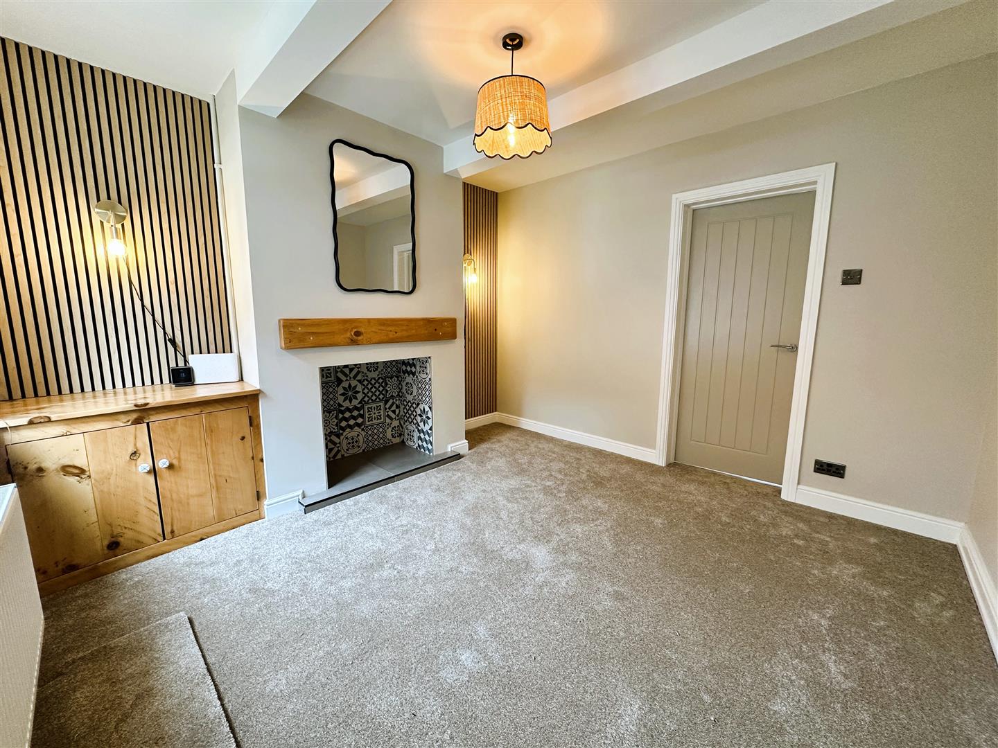 Well presented living room featuring new carpet, neutral decor with slatted oak feature walls, and a decorative fireplace.
