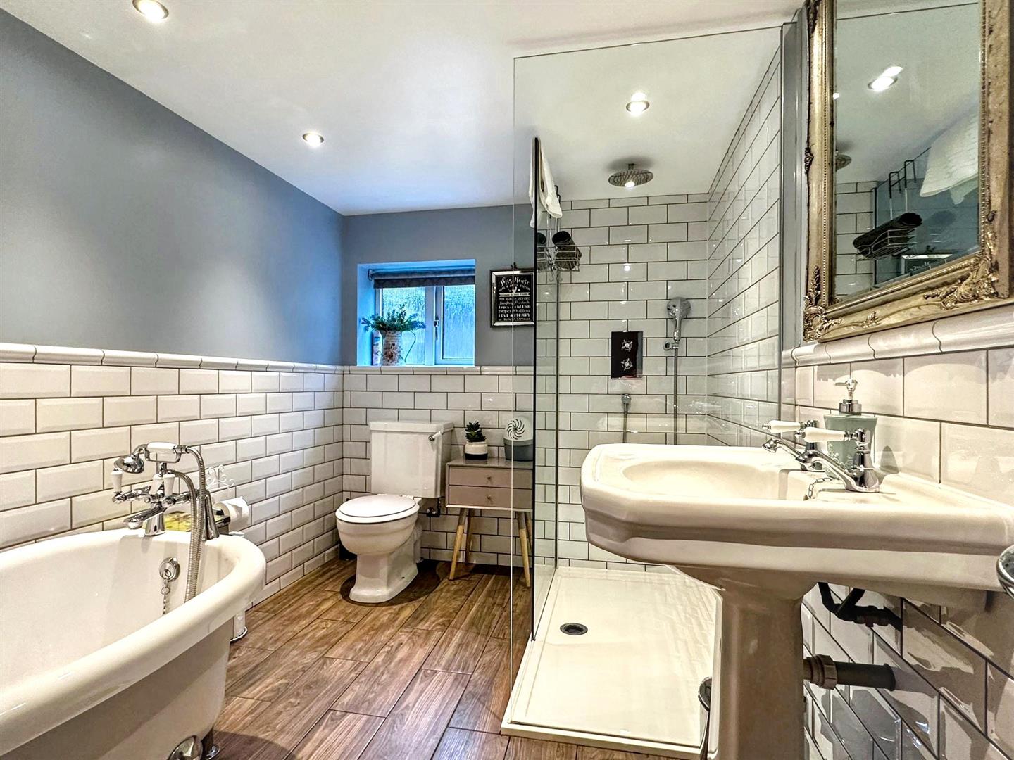 Wooden design flooring. WC. Pedestal style wash hand basin. Walk-in shower. Rain style shower. Shower attachment. Obscured UPVC window. Inset spotlights.