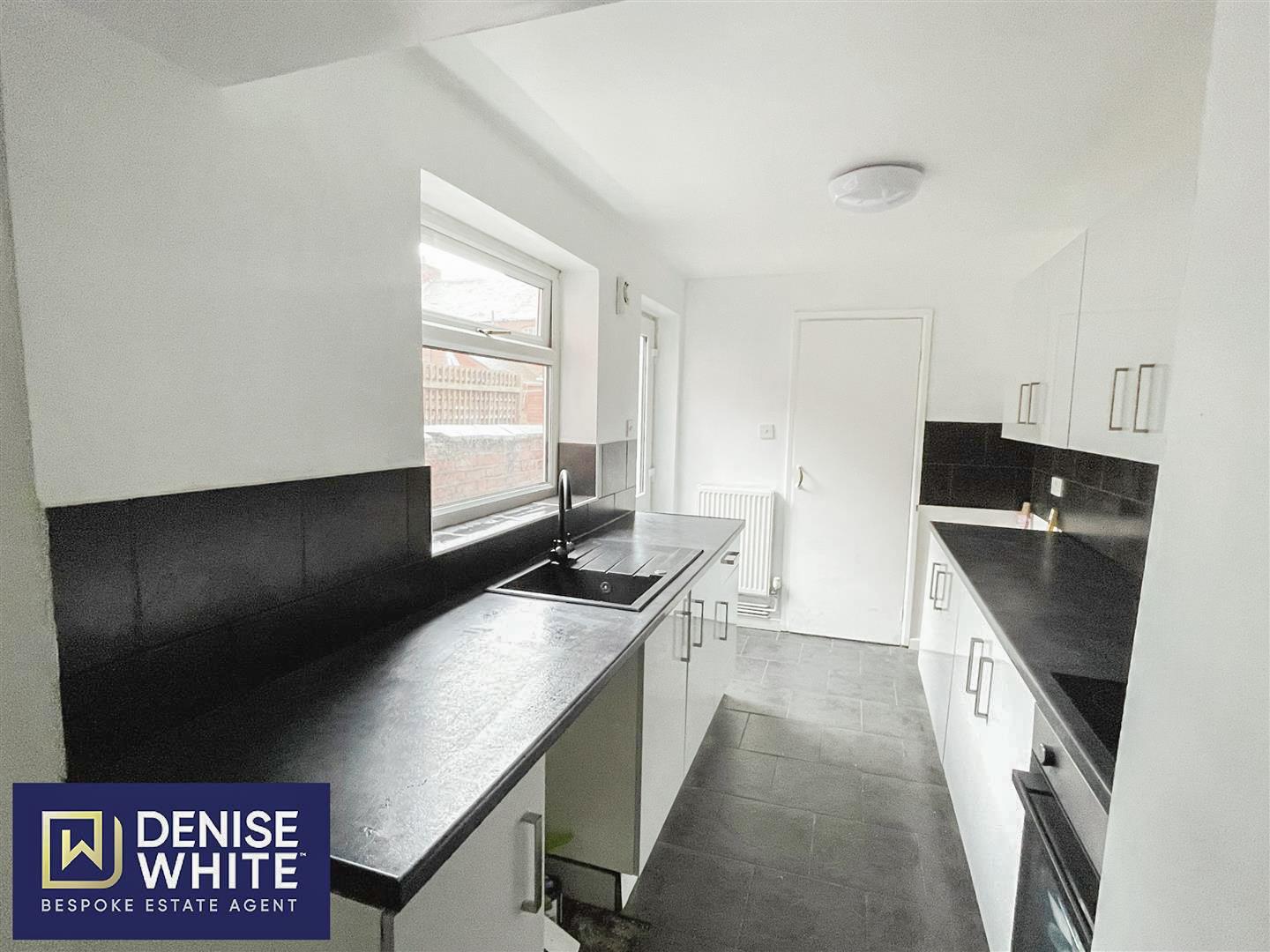 Lino flooring. Radiator. A range of fitted units to the base and eye level. Four ring electric hob. Extractor fan. Electric oven. Composite sink with drainer. Plumbing for a washing machine. Space for freestanding fridge freezer. uPVC door double glazed door and window to the side aspect.