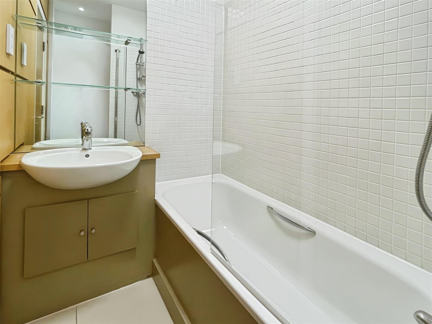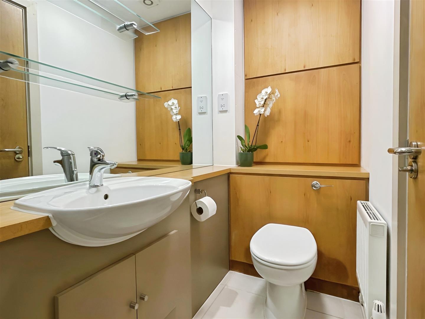 Tiled flooring. Vanity style wash handbasin. WC. Wall mounted radiator. Wall light.