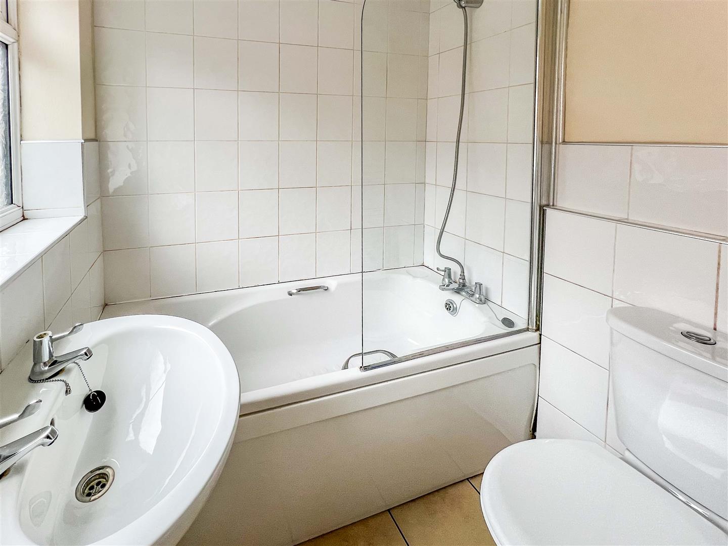 Part tiled walls with a white suite comprising bath with shower attachment, wash basin and W.C. heated towel rail. tiled flooring, uPVC double glazed window.