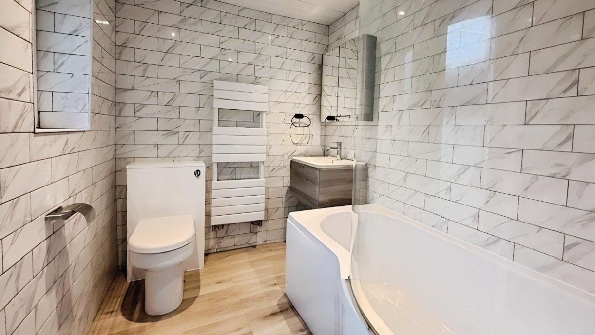 To the first floor are two well-proportioned bedrooms and a stylish bathroom, which has been finished to a high standard and features a modern white suite including a panelled bath, vanity wash hand basin, and WC. The bathroom is complemented by marble-effect wall tiling, wood-effect flooring, a heated towel rail, and mirrored storage.