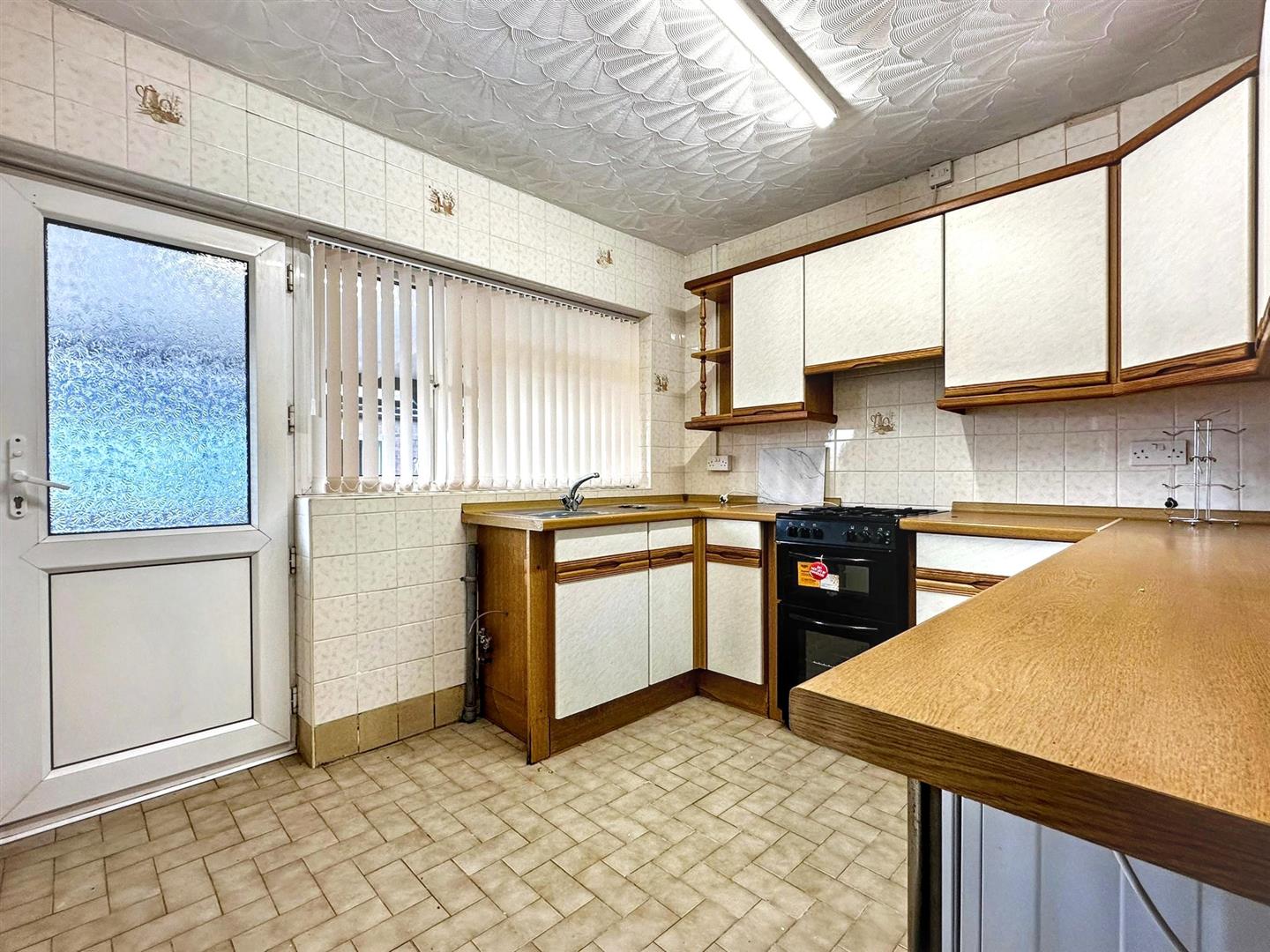 Fully tiled walls and patterned tile effect flooring, and fitted with a range of wall and base units with worktops. New freestanding gas cooker, stainless steel sink with mixer tap, and space for a washing machine, fridge freezer, and under counter appliance. Benefiting from a pantry cupboard, and with a uPVC window and back door that leads to the garden.