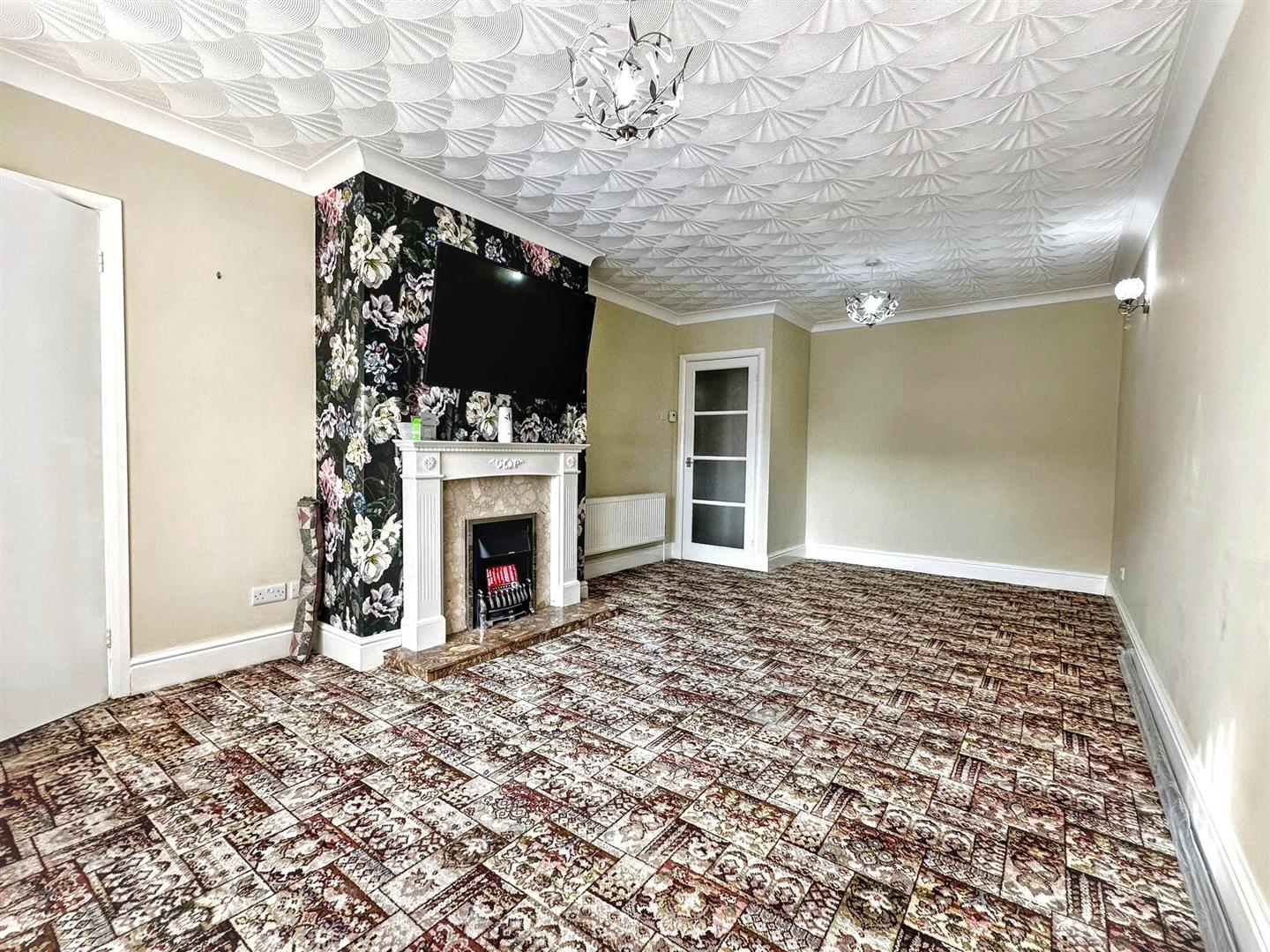 Good-sized lounge with fitted carpet and neutral décor, with feature wallpaper to the chimney breast and a focal fireplace. The room has both wall and ceiling light fittings, a uPVC window, and a door leading to the inner hall.