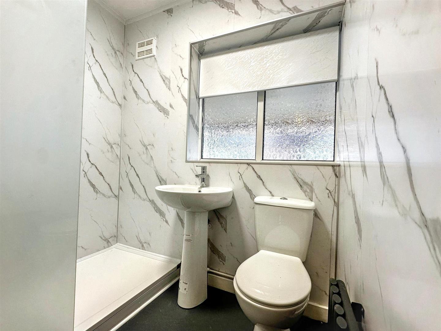 White marble pattern shower paneling to the walls. Featuring a white suite comprising a WC, pedestal basin, and step-in shower enclosure with glass screen and thermostatic shower with both handheld and rainfall heads.