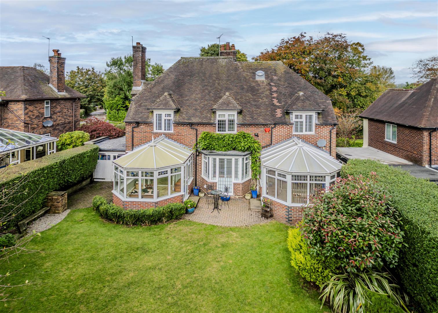 Externally, there is a paved driveway leading to a single garage, bordered by mature hedgerows and a beautifully maintained front garden. The rear garden is a true oasis, featuring a well-kept lawn and an initial patio area accessible from either conservatory. A large wooden gazebo structure provides the perfect spot for relaxation or hosting gatherings, surrounded by well-stocked borders with established plants.