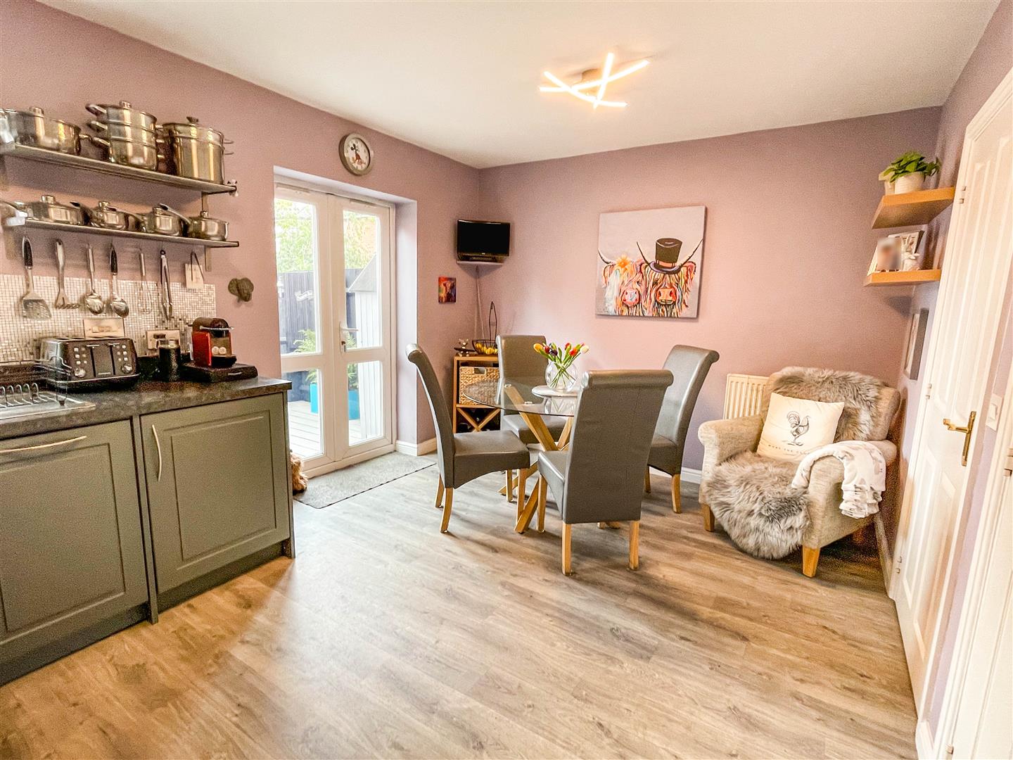 Fitted with a range of wall and base units with worksurfaces over incorporating a stainless steel sink and drainer unit with hose mixer tap. Integrated four ring ceramic hob with extractor over and single electric oven. Integrated dishwasher. Lino flooring. uPVC sash style window to the rear aspect. uPVC French doors leading to the rear garden. Wall mounted Vaillant gas central heating boiler. Two ceiling lights. Radiator. Door leading into: –