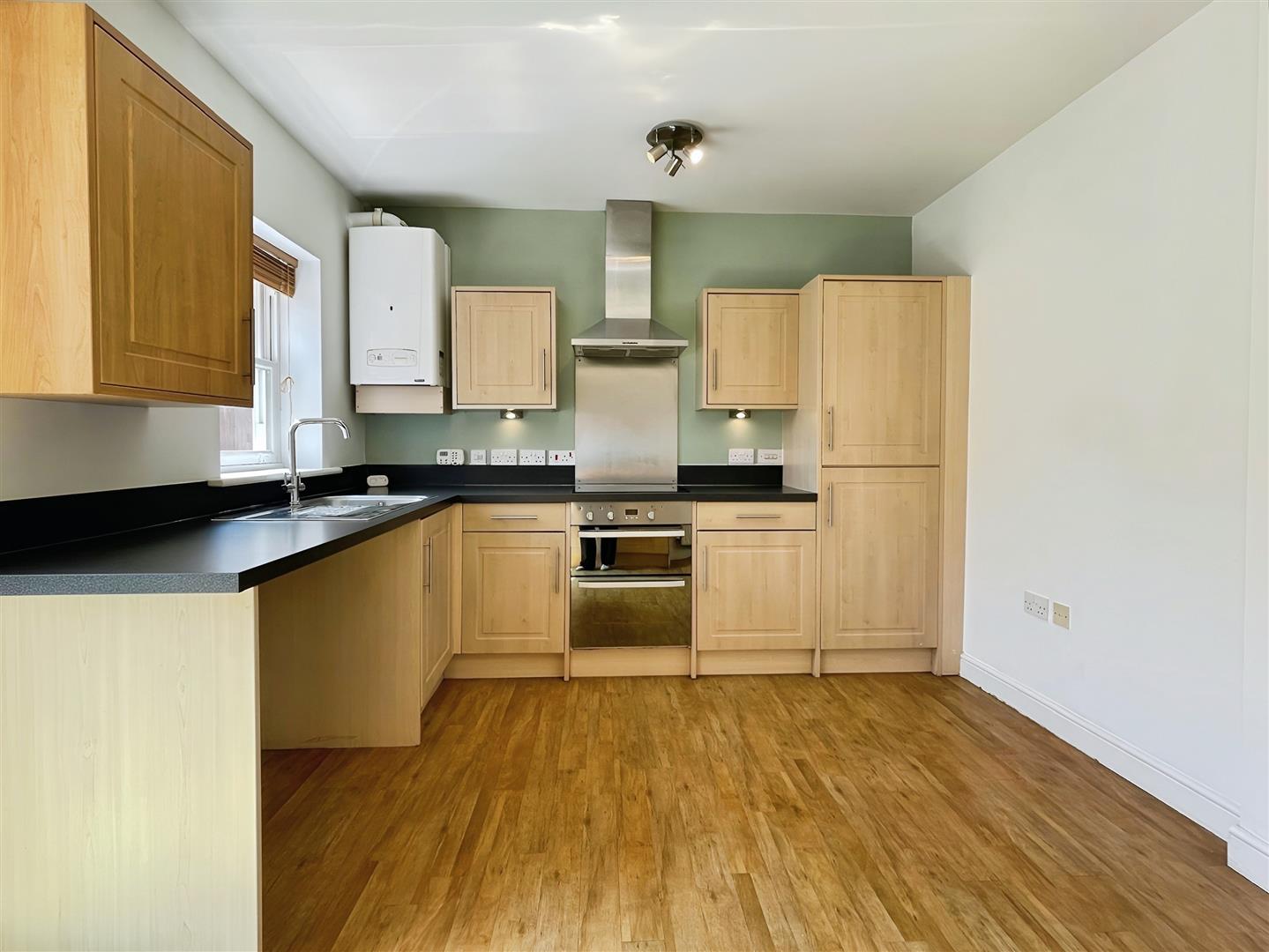 Wood effect flooring. A range of wall and base units with laminate worksurfaces above. Integrated electric oven and grill with electric hob and extractor fan above, stainless steel sink and drainer unit with mixer tap above, fridge, and freezer. Wall mounted combination boiler. UPVC double glazed window to the rear aspect. French doors to the rear aspect. Wall mounted radiator. Two ceiling lights.