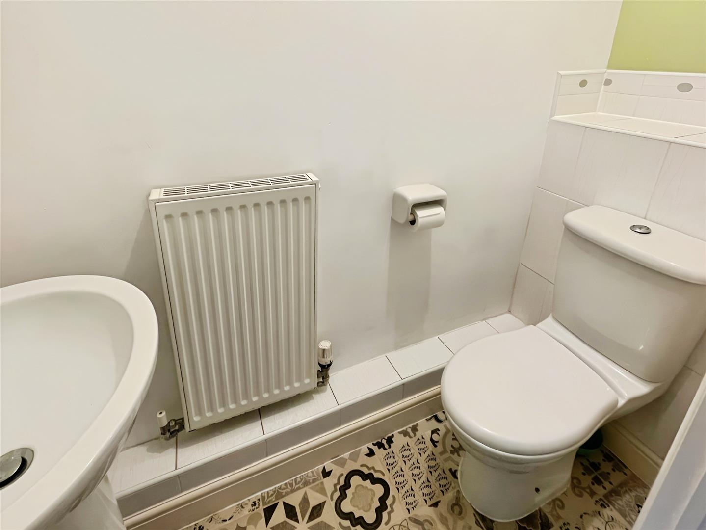 Vinyl flooring. Low level WC. Pedestal style wash hand basin. Wall mounted radiator. Ceiling light. Extractor fan.