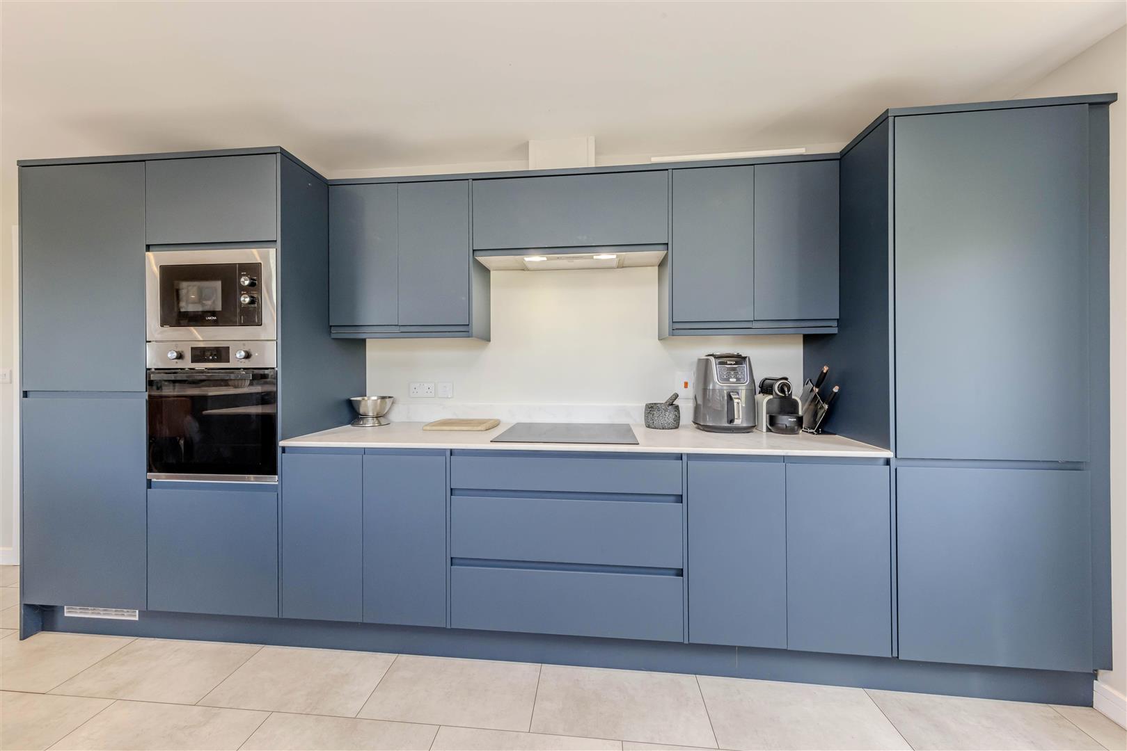 Tiled flooring. A range of Matt wall and base units with quartz worktops above. Integrated fridge, freezer, dishwasher, washing machine, Lamona oven, Lamona microwave, Lamona hob with extractor above sink and drainer unit with mixer tap above. Large breakfast bar with quartz worksurface. Composite door to the side aspect. Two uPVC double glazed windows to the rear aspect. Inset spotlights.
