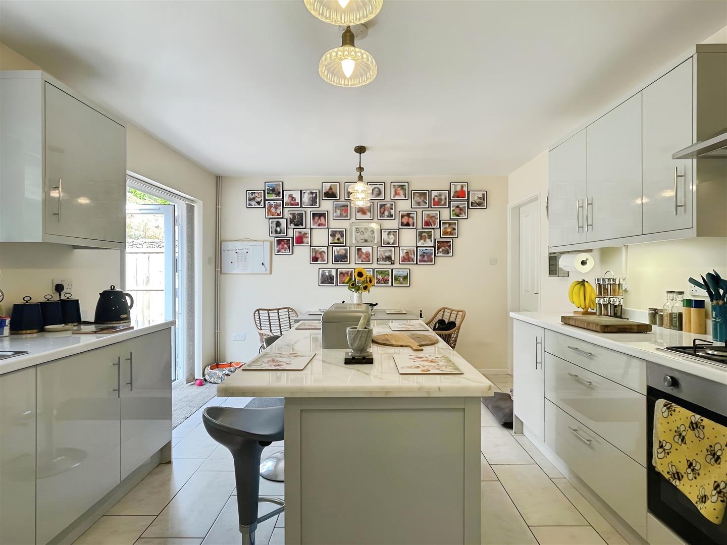 Continued tiled flooring. Gloss wall and base units with laminate worksurfaces above. Cupboard housing combination boiler. Undercounter space for washing machine and tumble dryer. UPVC double glazed window and door to the rear aspect. Ceiling light.