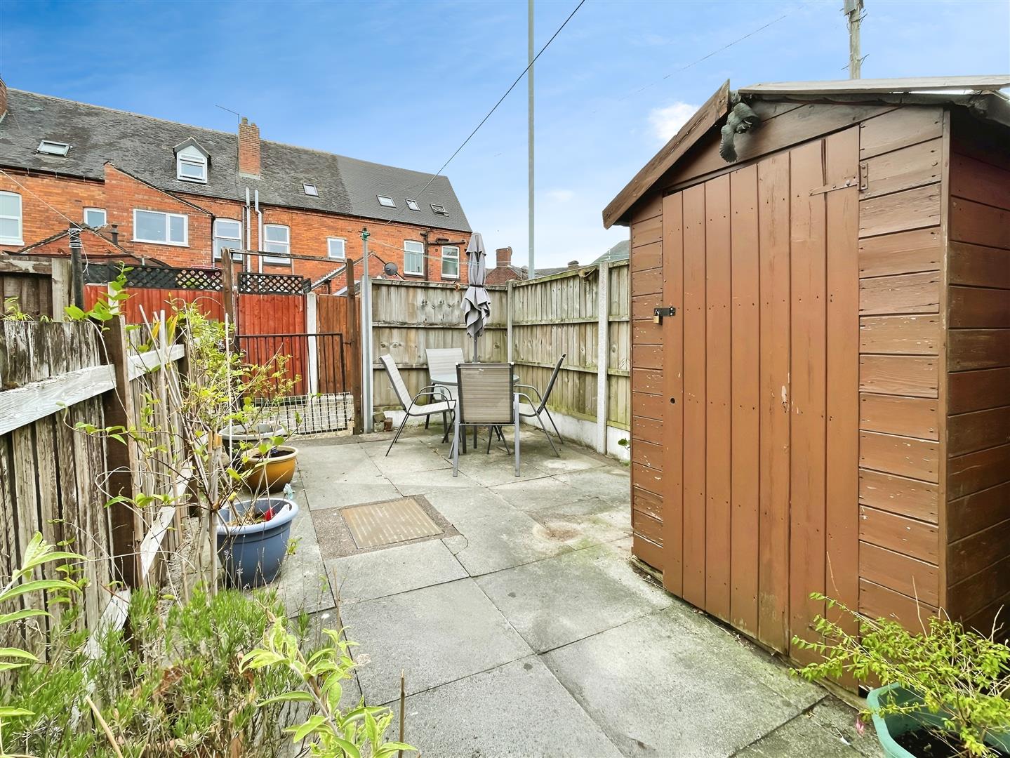 To the rear of the property is an enclosed paved yard with a useful storage shed.