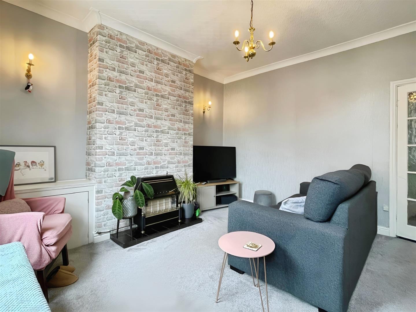 Fitted carpet. uPVC door to the front aspect. Wall mounted radiator. Gas Fire. uPVC double glazed window to front aspect. Two wall lights. Coving. Ceiling light.
