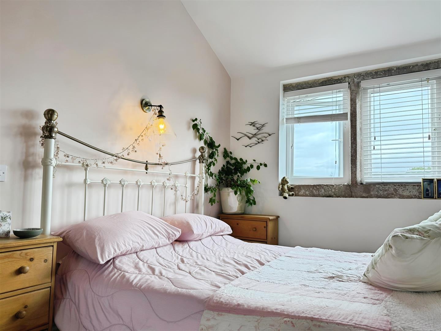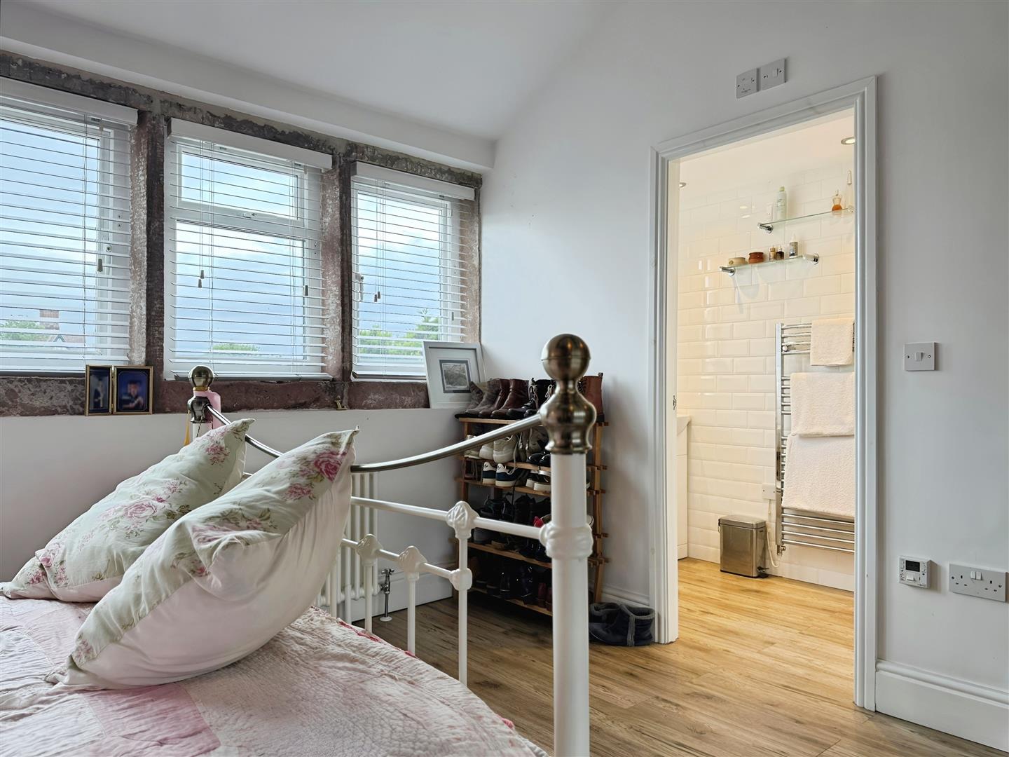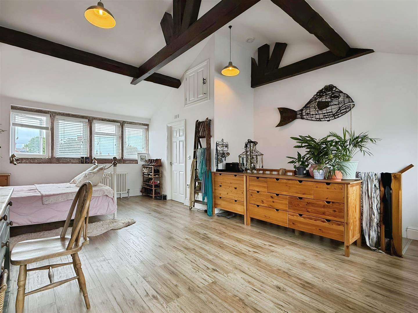 Stairs lead to the stunning top floor master bedroom, a true retreat featuring original exposed brickwork, a mix of traditional and modern beams, and a feeling of open space and calm. The room is bathed in natural light and is completed by a private en-suite, adding both comfort and convenience.