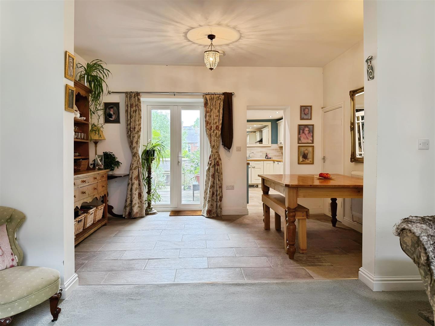 Tiled flooring. Fitted carpet. Wall mounted radiators. Open brick fireplace. Double glazed window to the front aspect. Double doors leading to outside. Access to cellar. Access to kitchen. Ceiling lights.