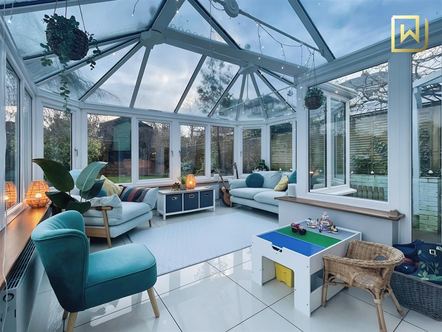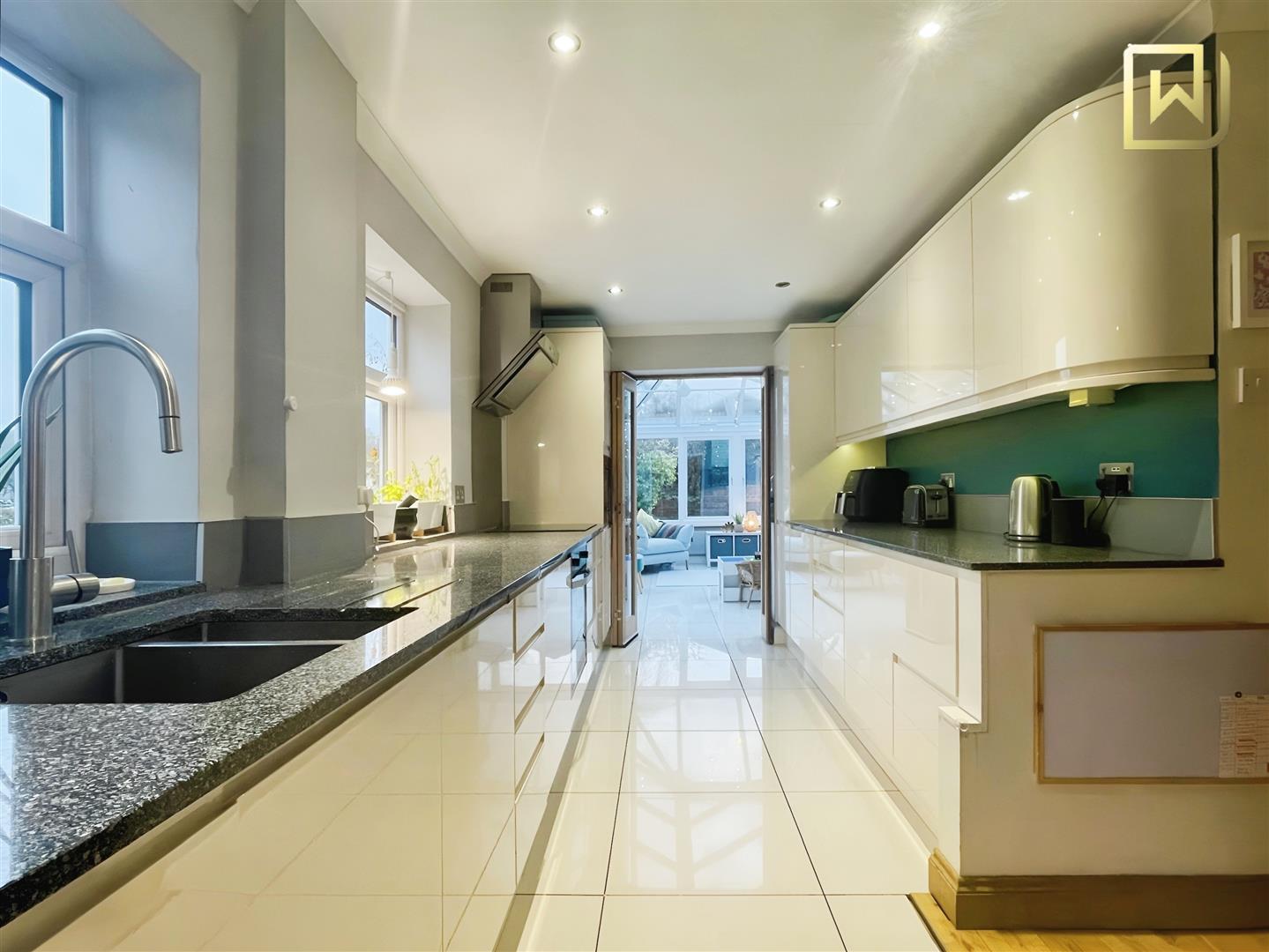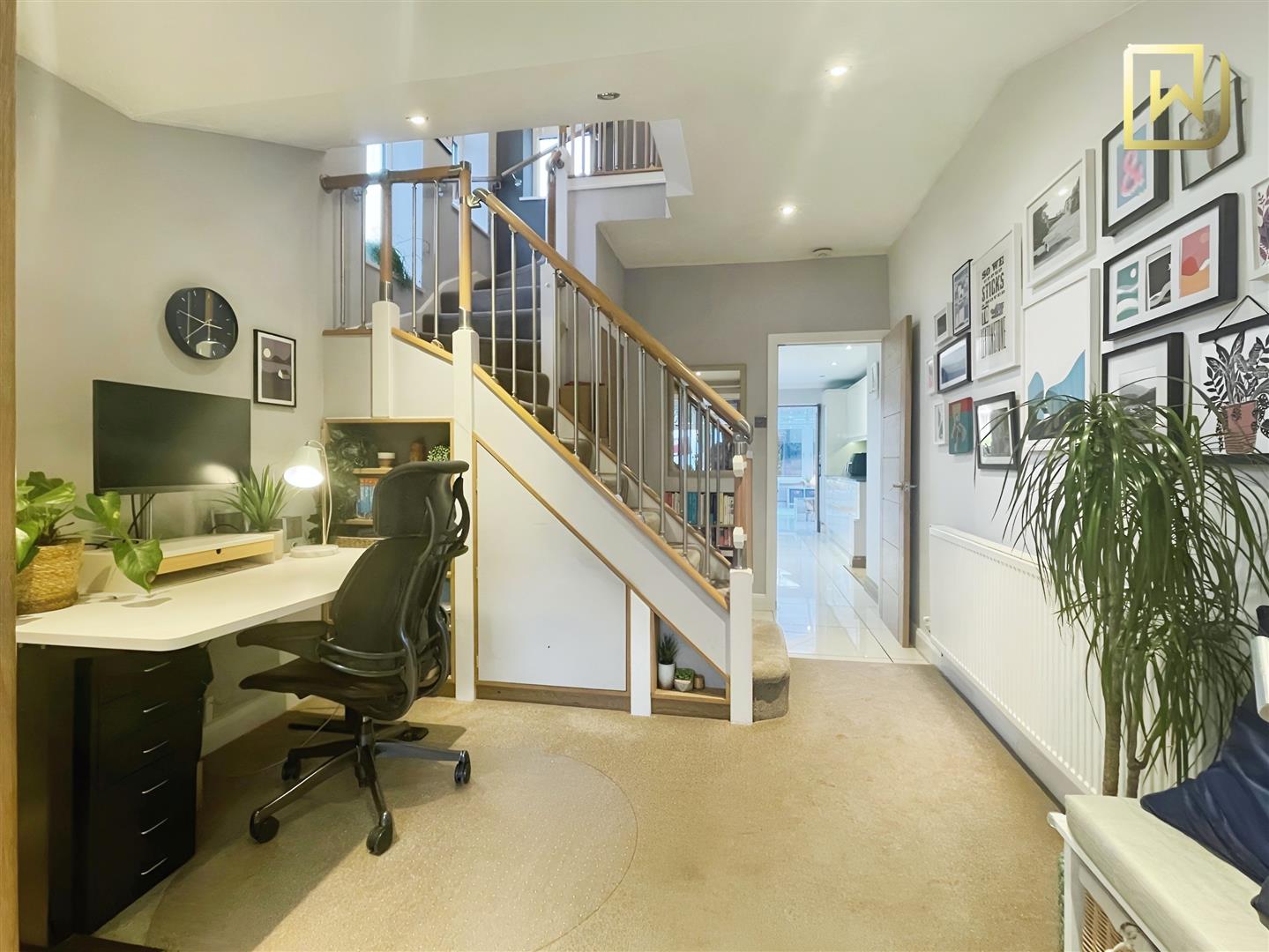 This stunning property features three large reception rooms as well as a spacious and elegant entrance hall currently used as a work space but could be further enhanced to provide ample storage solutions. The living room is located at the front of the property and features a bay window allowing in ample light. The dining room boasts bifold doors creating a connection between indoors and outdoors, ideal for al fresco dining. The kitchen features modern gloss cabinets with granite work surfaces above as well as a range of integrated appliances. Folding doors lead onto the conservatory which is bathed in natural light and provides direct access to the rear garden. There is also a downstairs WC for added convenience.