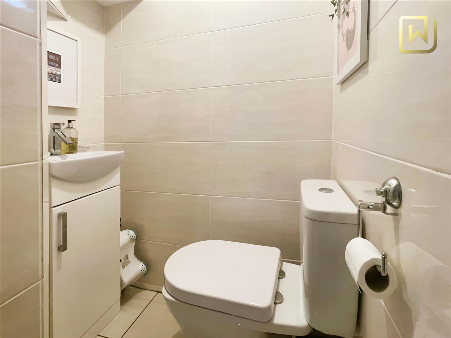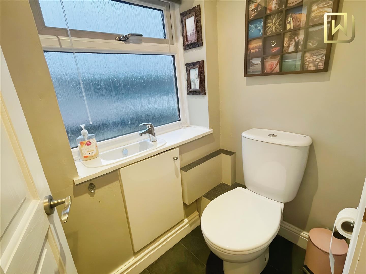 Continued tiled flooring. Tiled walls. Low-level WC. Cloakroom wash handbasin with storage underneath. Obscured UPVC double glazed window to the rear aspect. Ceiling light.