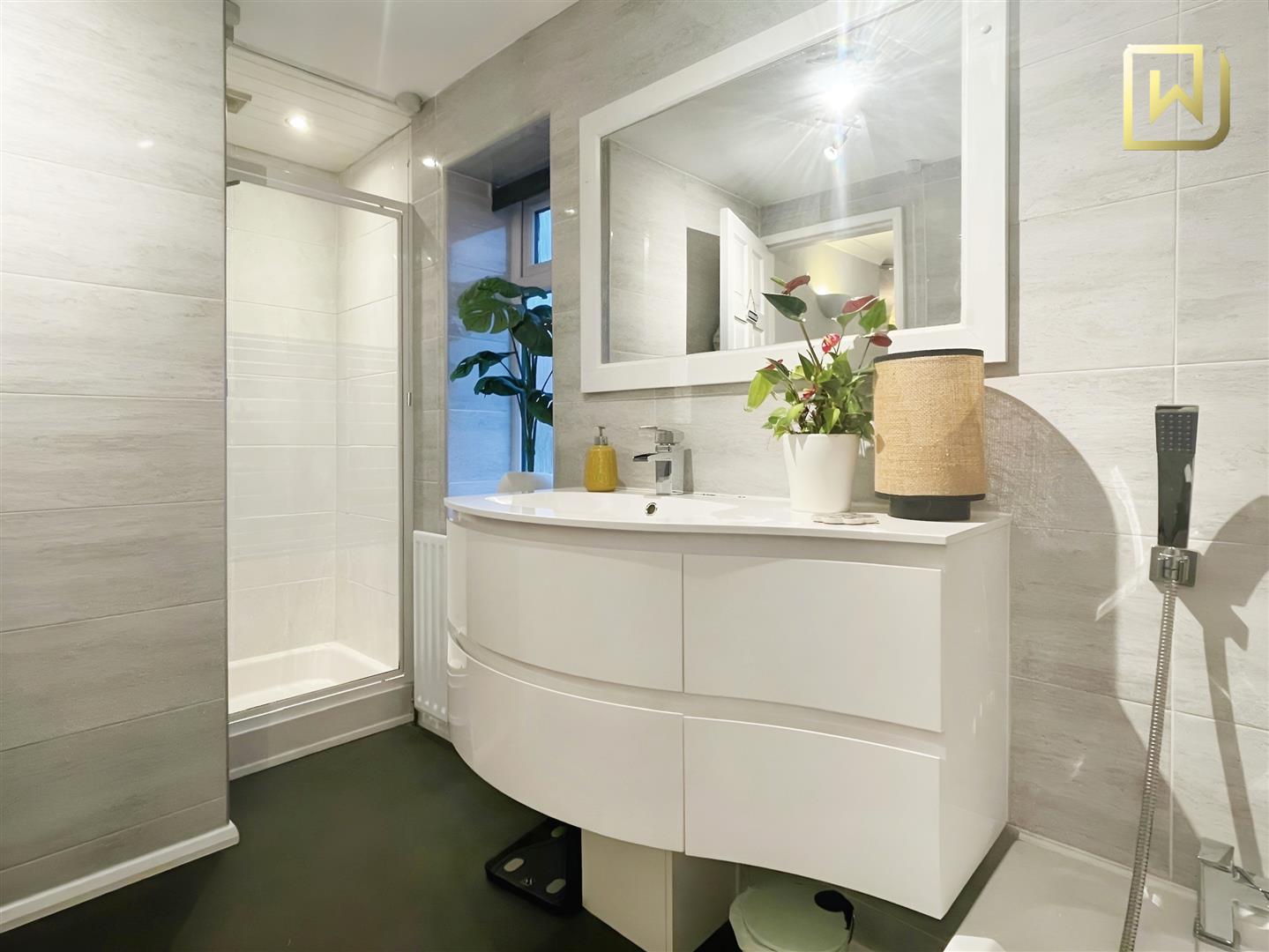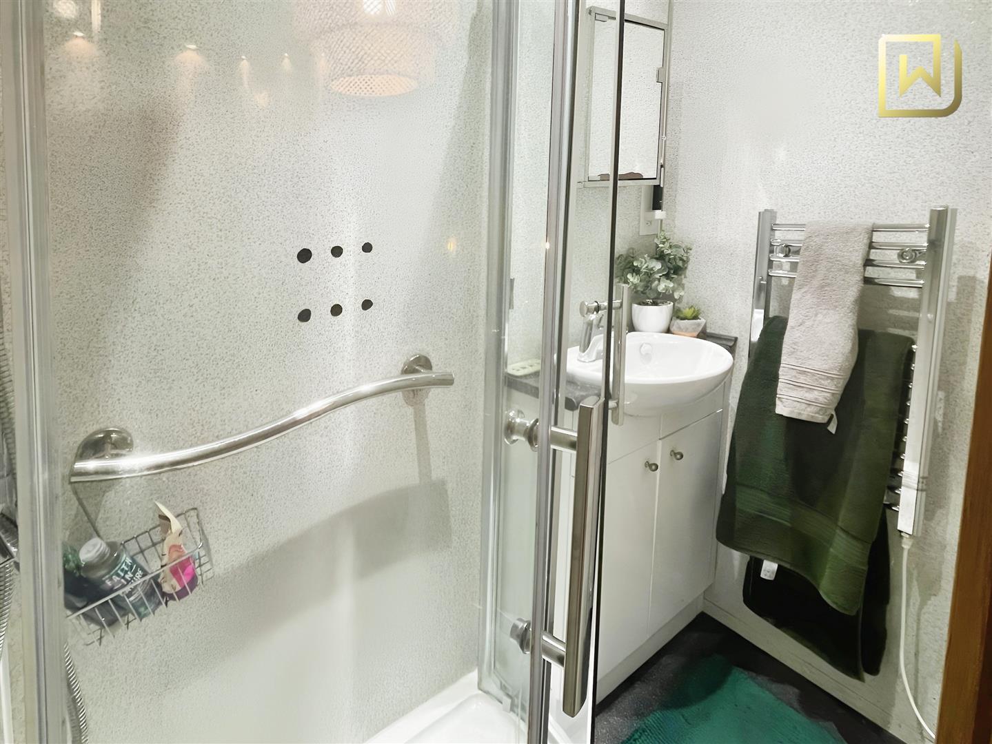 Vinyl flooring. Shower cubicle with shower. Vanity unit with wash handbasin above. Wall mounted towel rail. Extractor fan. Spotlights.