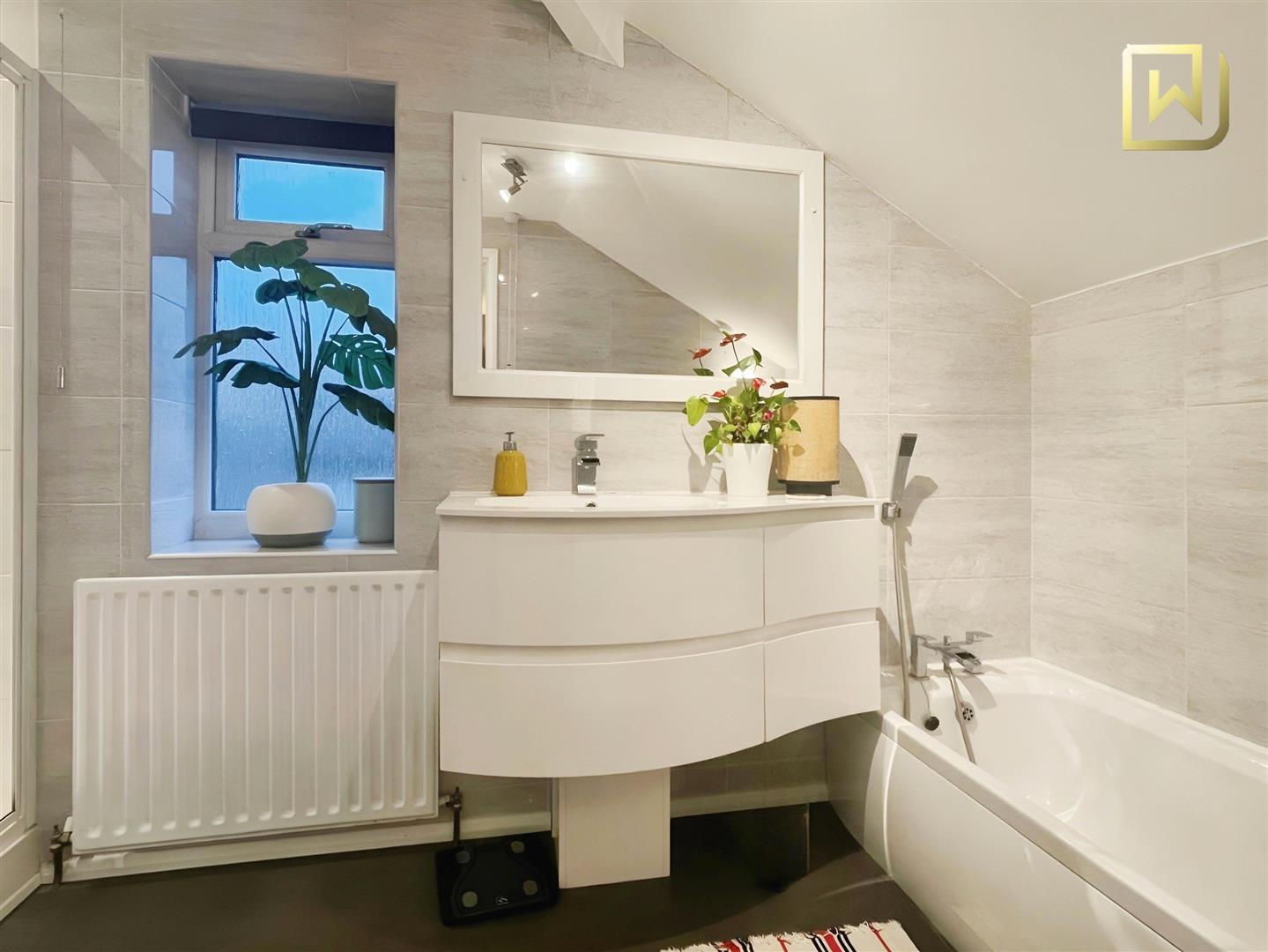Vinyl flooring. Partially tiled walls. Wall mounted radiator. Fitted bath with shower attachment. Wall mounted vanity unit incorporating wash handbasin. Shower cubicle with electric shower. Obscured UPVC double glazed window to the front aspect. Wall light. Ceiling lights.