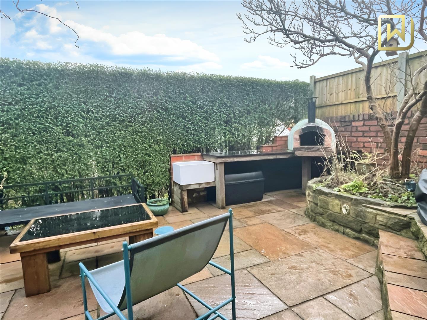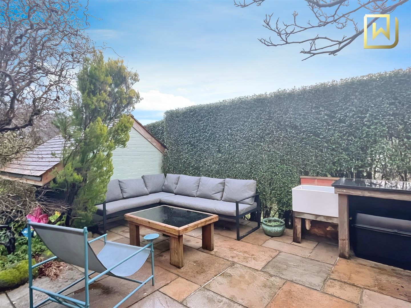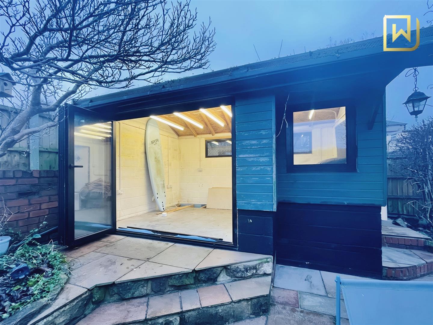 To the rear of the property there is a private and enclosed garden. With paved patio seating areas, one of which features an outdoor Kitchen complete with a pizza oven, alongside a good sized lawn; the perfect space for children and pets to play and for family and friends to gather. At the end of the garden, there is a block built garden store which has recently been fitted with a new cedar shingle roof, and a fabulous garden room:-