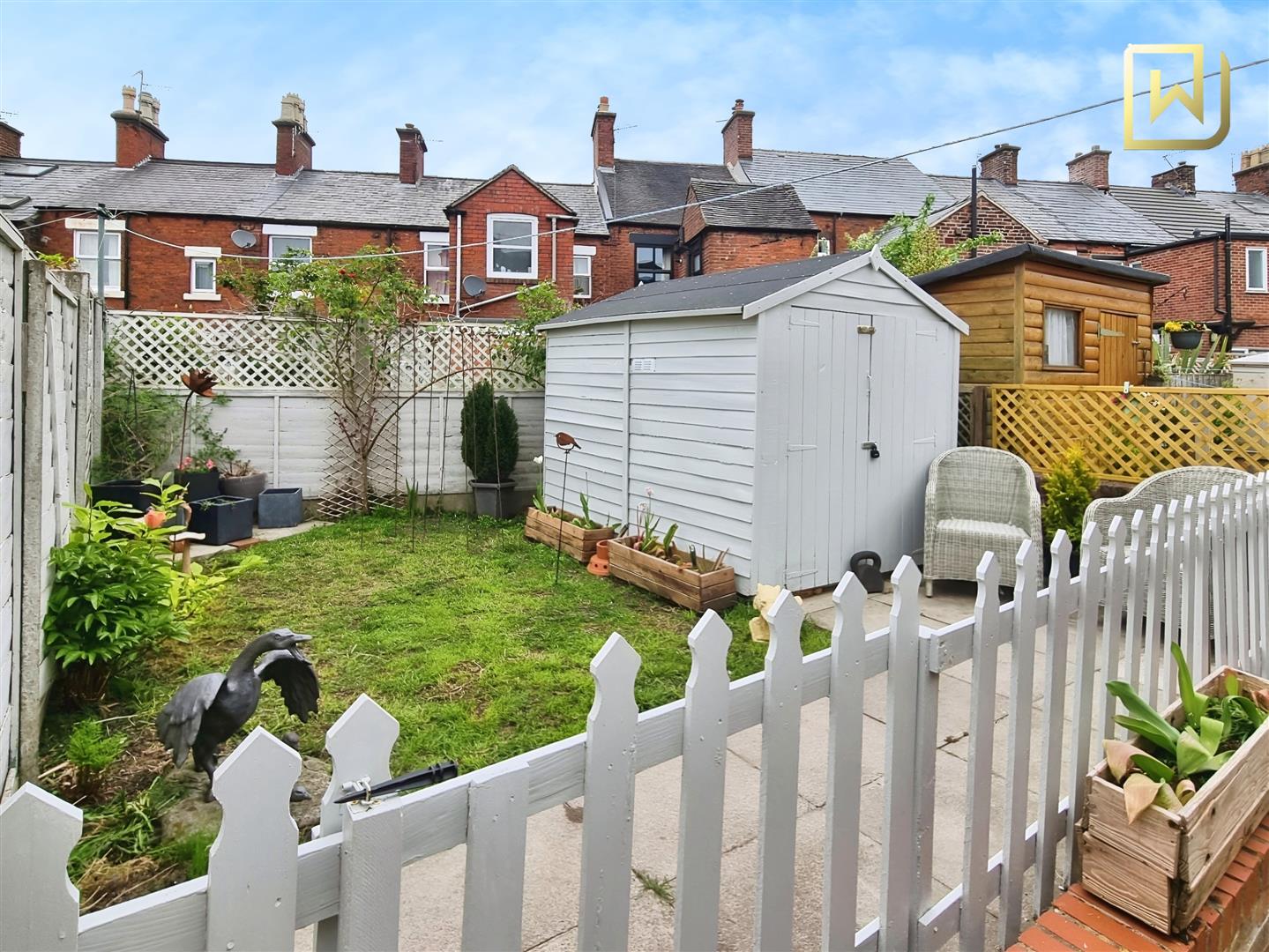 To the rear of the property initially is a gated paved area accessed from the kitchen. Beyond is a separate raised lawn which is also fenced and hosts a large wooden shed.