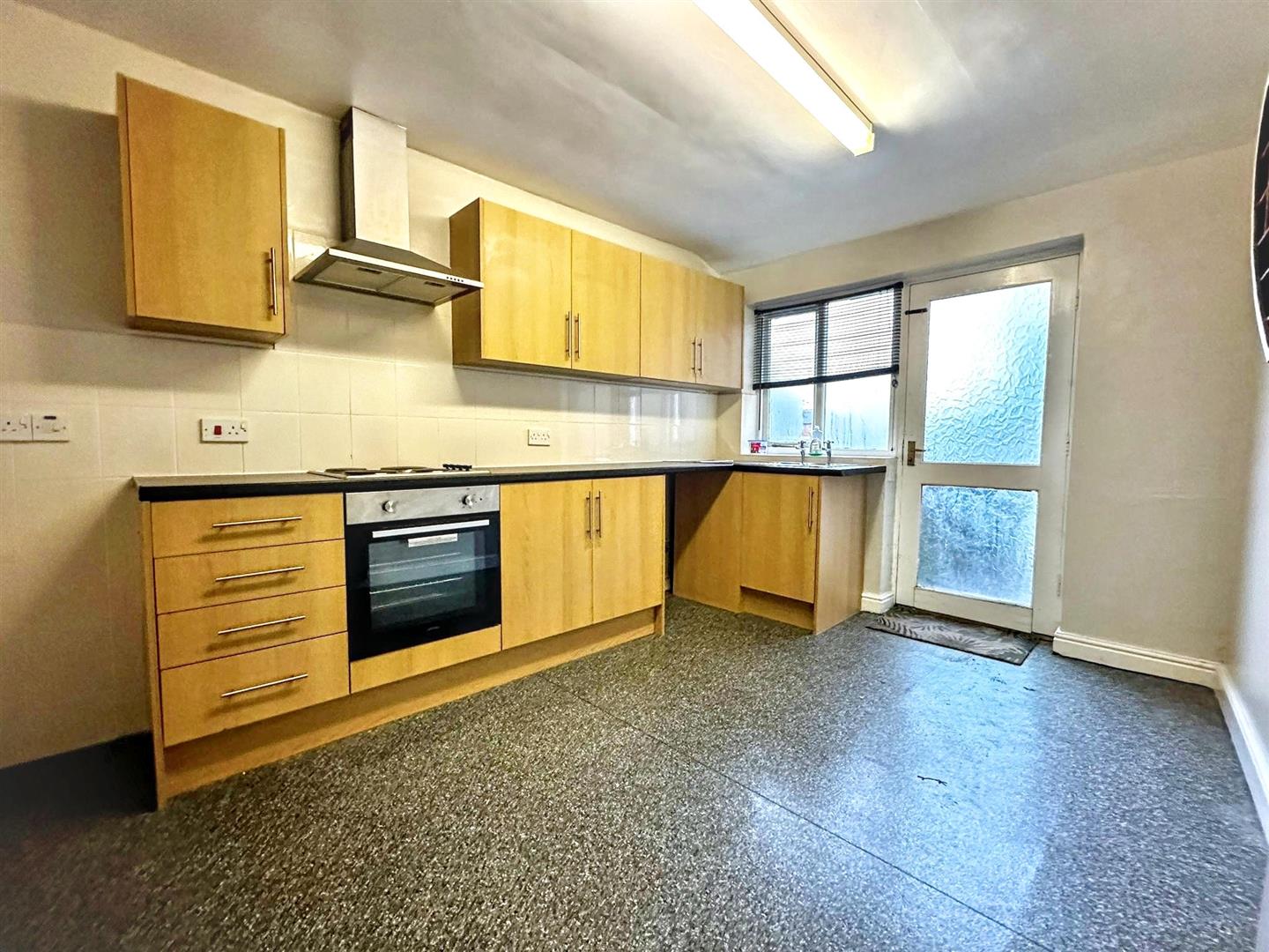 Laminate flooring. Fitted with a range of wall and base units. Integrated oven. Hob. Stainless steel sink unit. Access to outside. Window to the rear aspect. Ceiling light.