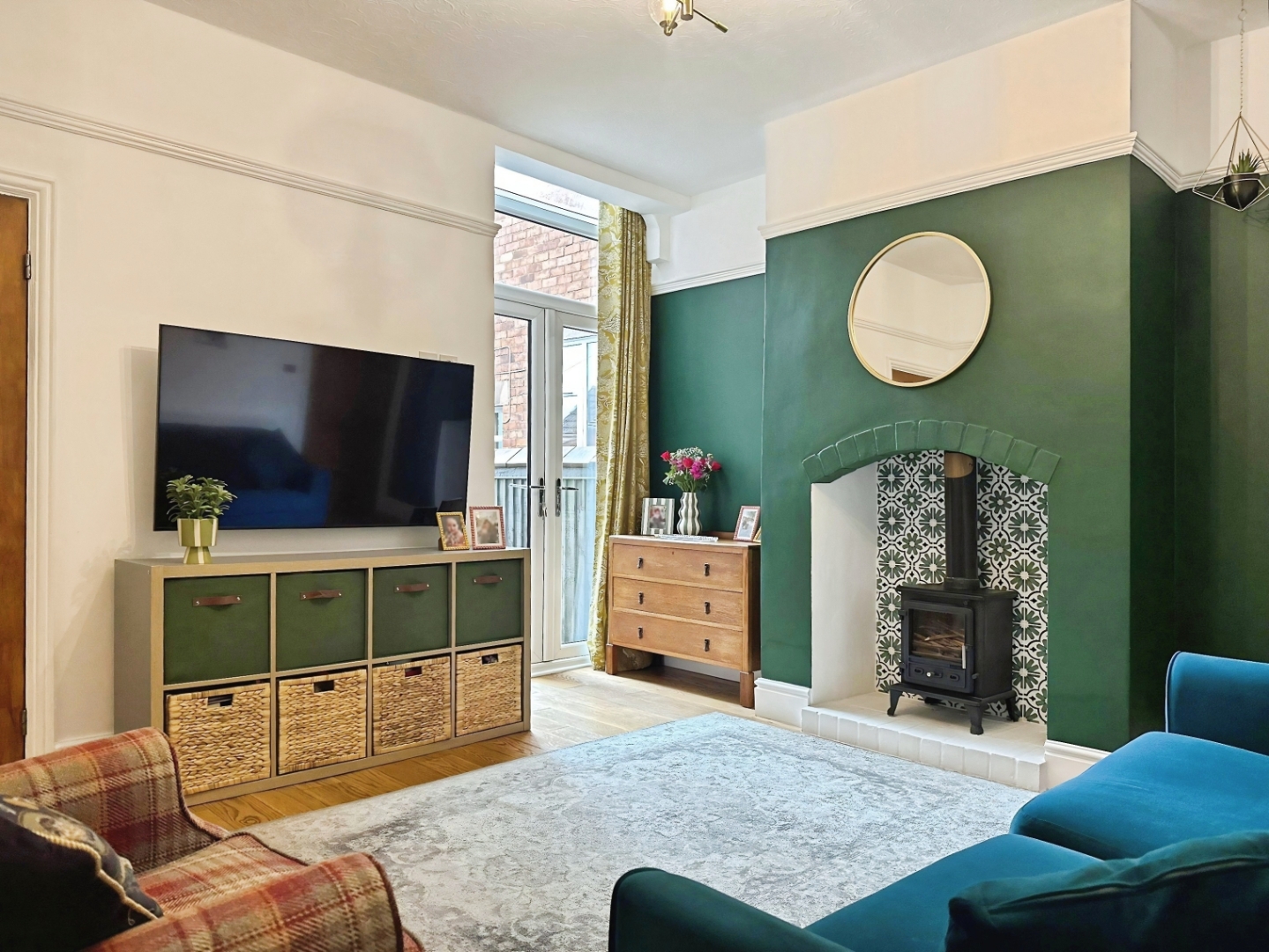 The property opens into a welcoming entrance hall featuring beautiful tiled flooring, decorative cornicing, and stairs rising to the first floor, immediately setting the tone for the character and charm found throughout the home. To the front, a cosy lounge enjoys a bay window, picture rail, and detailed coving, offering subtle hints of the property's heritage. Beyond this is a well-proportioned living room with a charming log burner and French doors opening onto the rear yard, creating a comfortable space to enjoy throughout the seasons. At the rear of the property sits a beautifully presented kitchen, fitted with striking navy blue shaker-style cabinets, butcher block worktops, and a traditional Belfast sink, along with direct access to the rear yard.