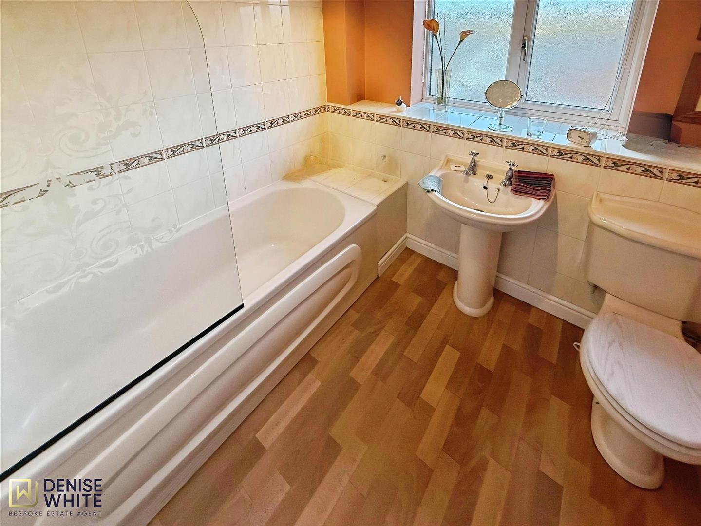 Laminate flooring, Wall mounted radiator. WC. Pedestal style wash hand basin. Fitted bath. Electric shower. Obscured UPVC double glazed window. Ceiling light.