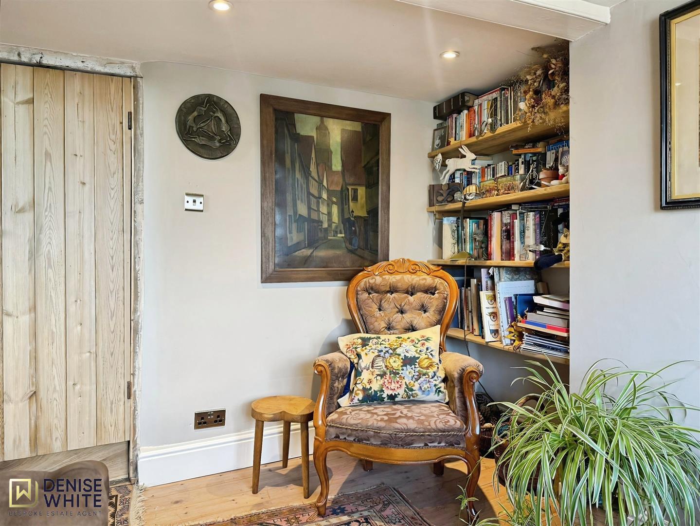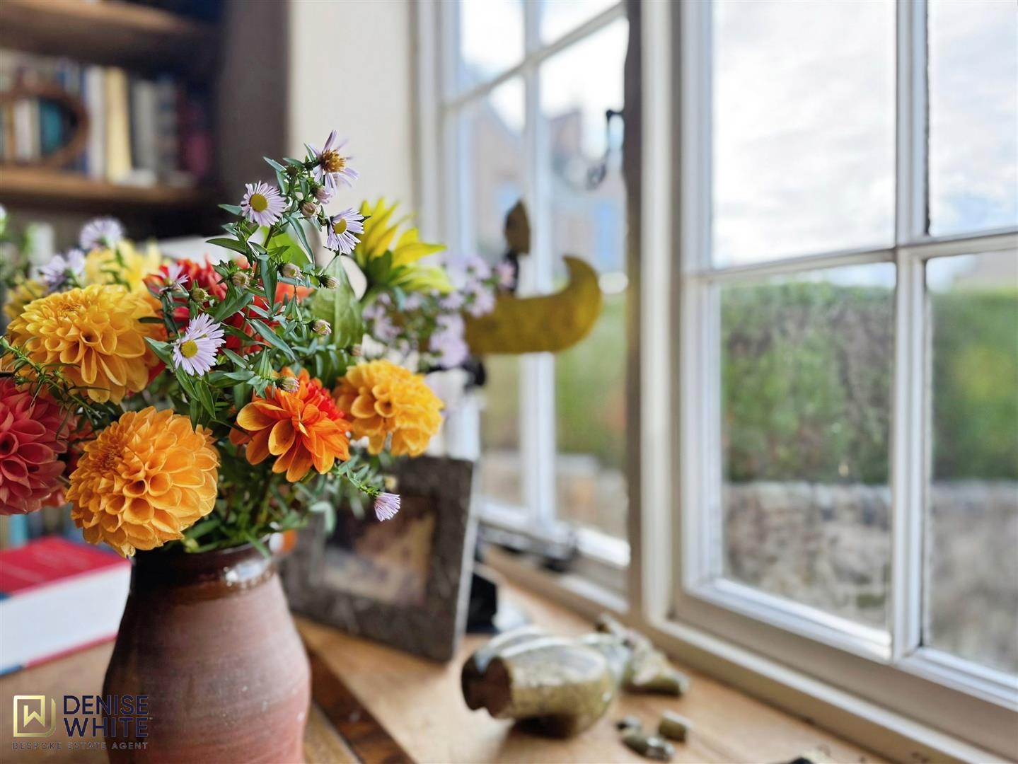 The heart of the home is the beautiful breakfast kitchen, featuring a traditional AGA that instantly sets a cosy, homely tone. A charming breakfast nook provides the perfect spot to enjoy morning coffee. The living room is wonderfully inviting, with its exposed brick chimney breast, log-burning stove, and bay window overlooking the enclosed garden and Brough Park beyond. It’s a space that truly comes alive in every season — warm and snug in winter, light and serene in summer.