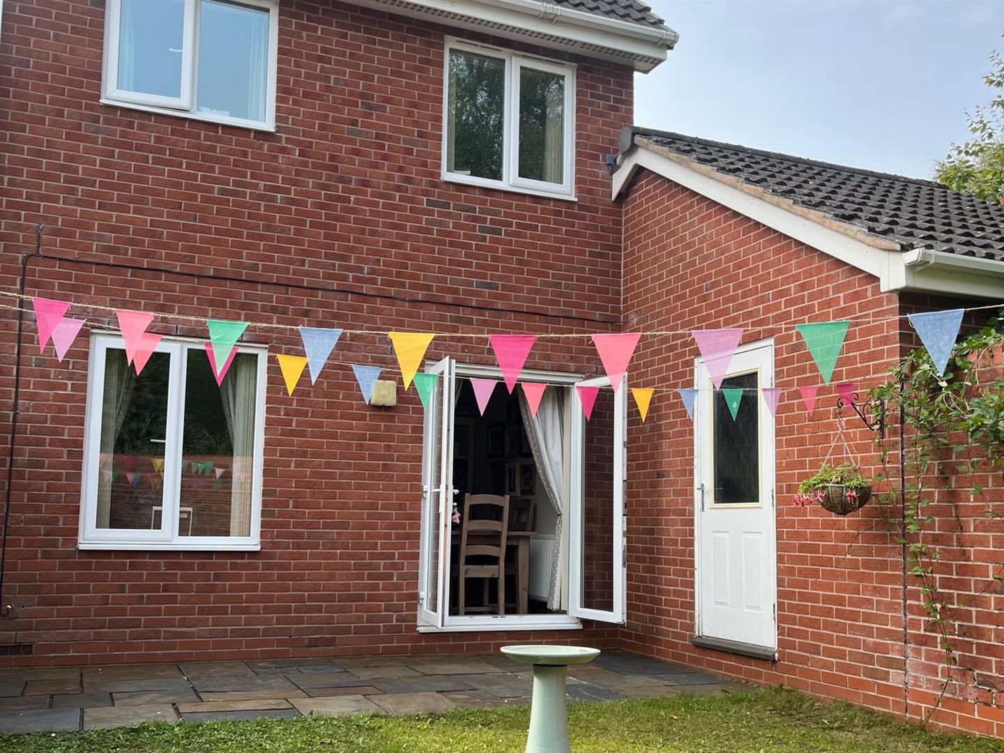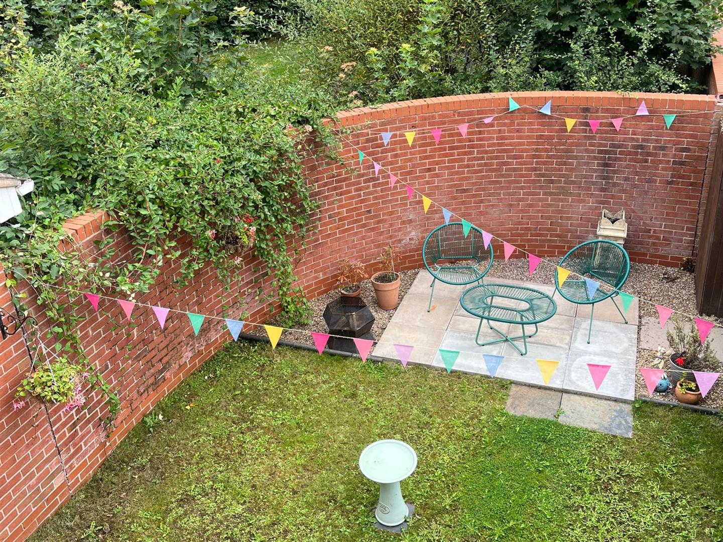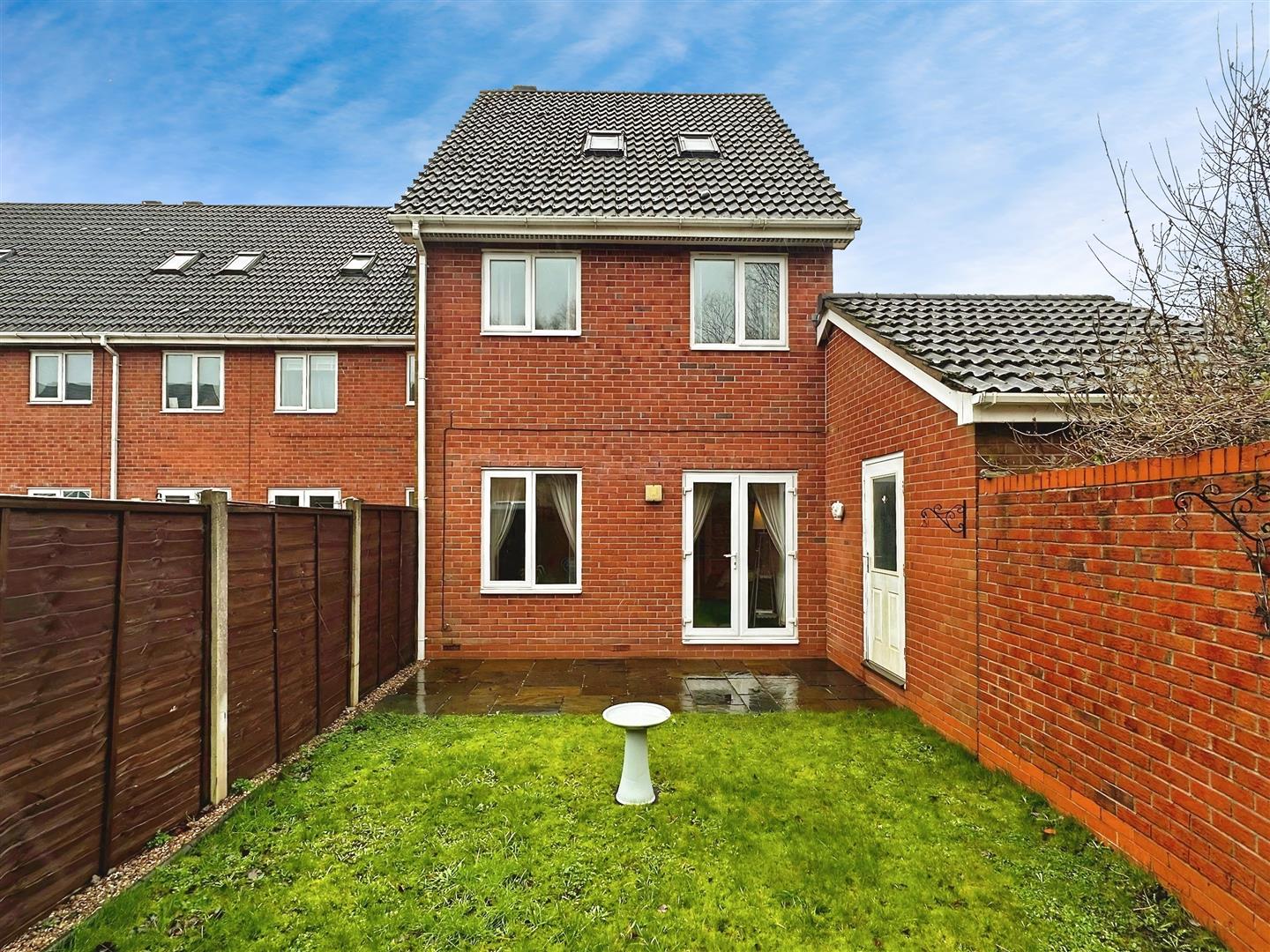 To the rear, the enclosed garden offers a private and manageable outdoor space, mainly laid to lawn with a paved patio area directly outside the rear doors—ideal for seating and outdoor dining. The surrounding fencing and brick wall boundaries provide a good level of enclosure, making it well suited to both families and those seeking a secure outdoor area.