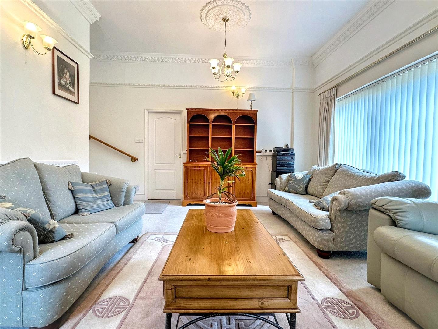 Internally, an inviting and spacious entrance hallway welcomes you into the home and leads through double doors into a superb living room. Featuring tall ceilings and dual aspect windows, this bright and airy space is both elegant and comfortable, with a beautiful feature fireplace forming a natural focal point. The living area flows into a beautifully presented breakfast kitchen, complete with shaker-style cabinetry, detailed coving, and access to the side of the property.