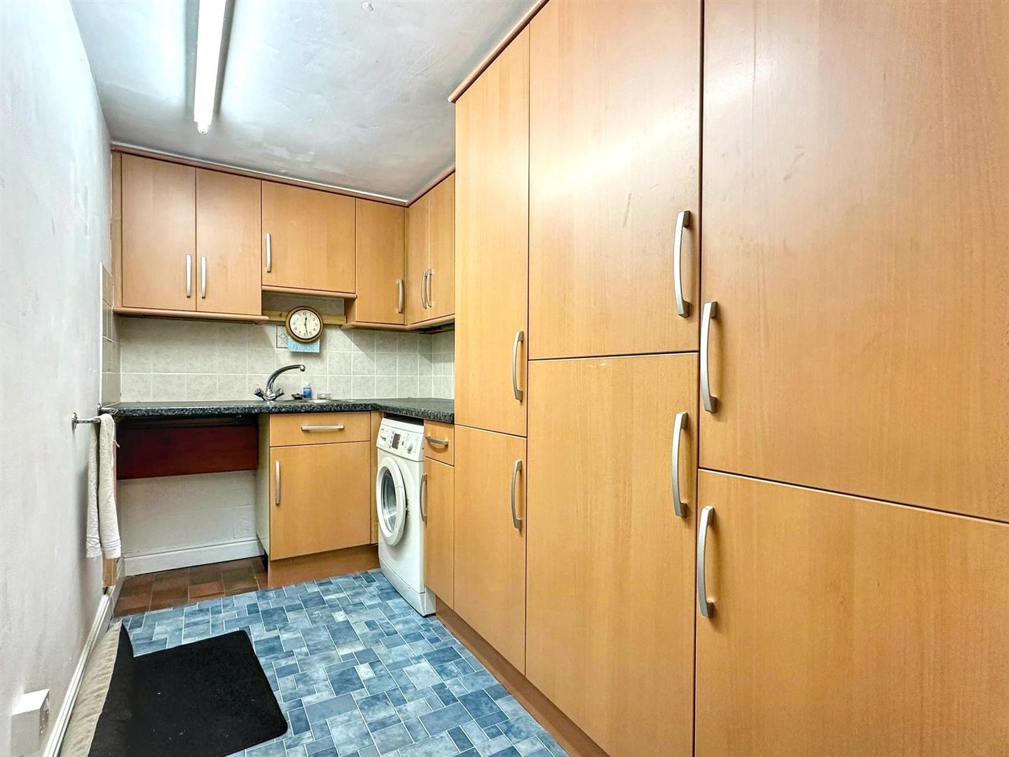 Vinyl flooring. Fitted with a range of wall and base units, plumbing for washing machine, space for dryer, stainless steel sink unit. Ceiling light. Door leading into garage.