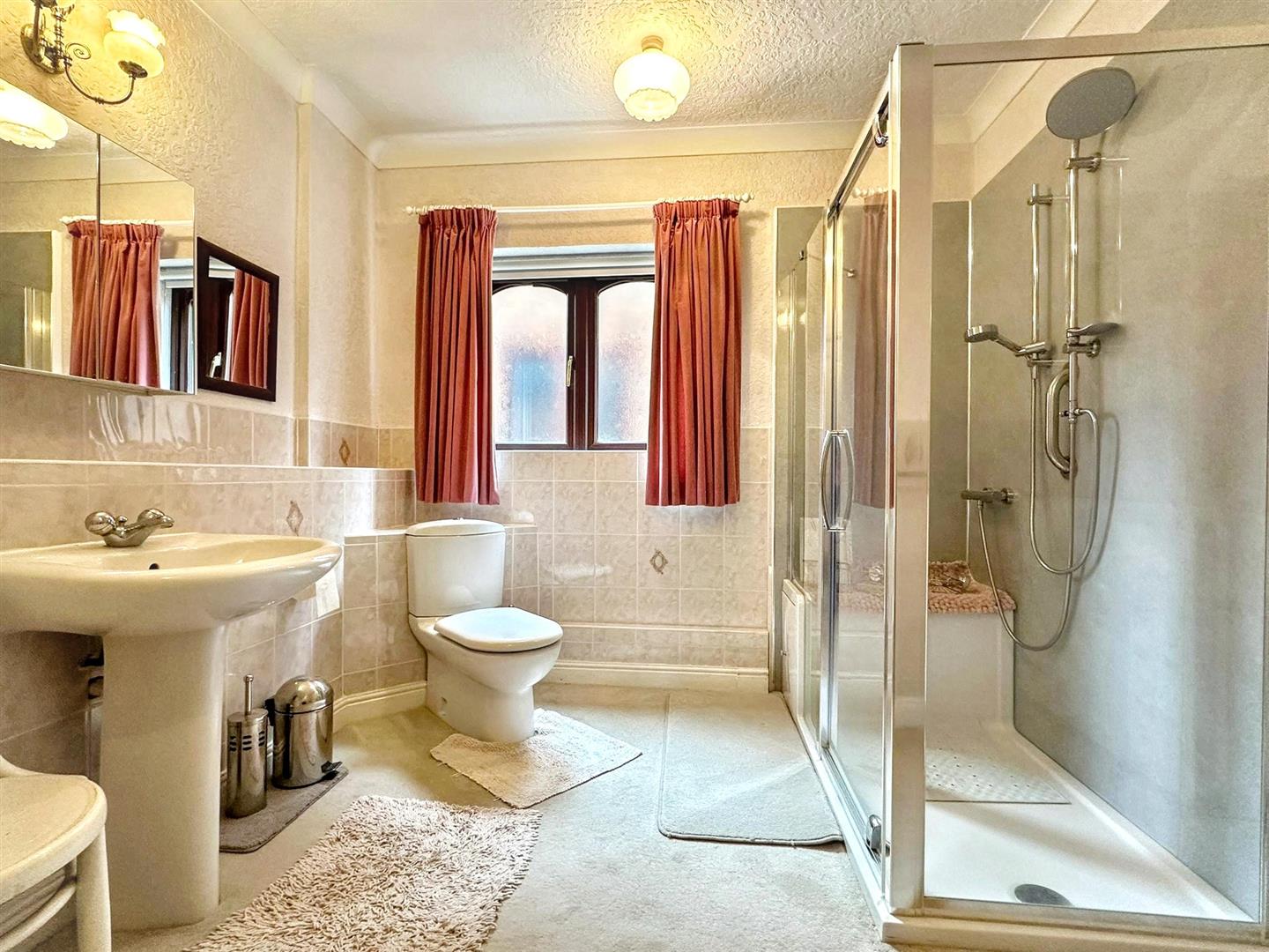 Suite is comprised of, low level WC, pedestal wash hand basin, shower cubicle with shower attachment. Shower cubicle with rain style shower attachment. Carpet. Radiator. Obscured uPVC window. Wall light. Ceiling lights.