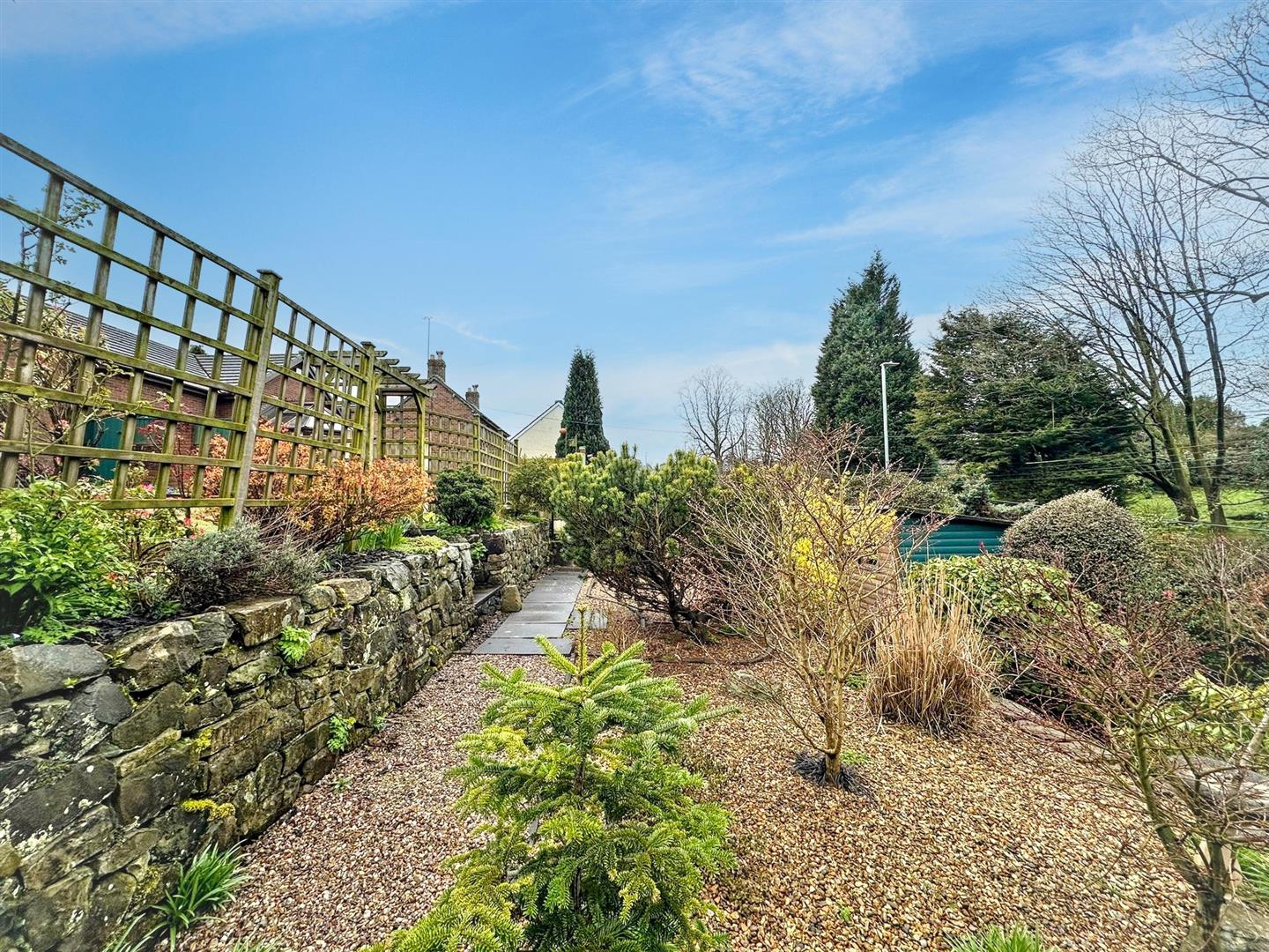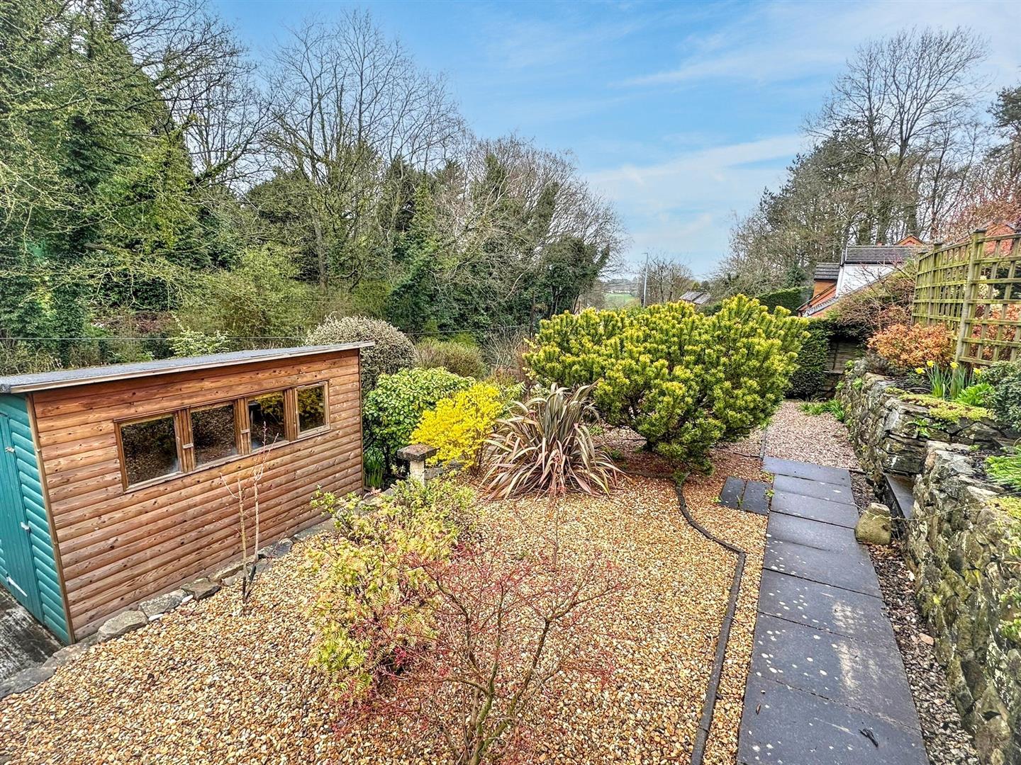 Externally, a pathway wraps around the property, with gated access leading to a well-maintained tiered garden. The outdoor space begins with a patio area, ideal for enjoying the warmer months, followed by a lawned garden with well-stocked borders. Beyond this is a gravelled area featuring a variety of mature shrubs and a large, useful storage shed complete with power and lighting.