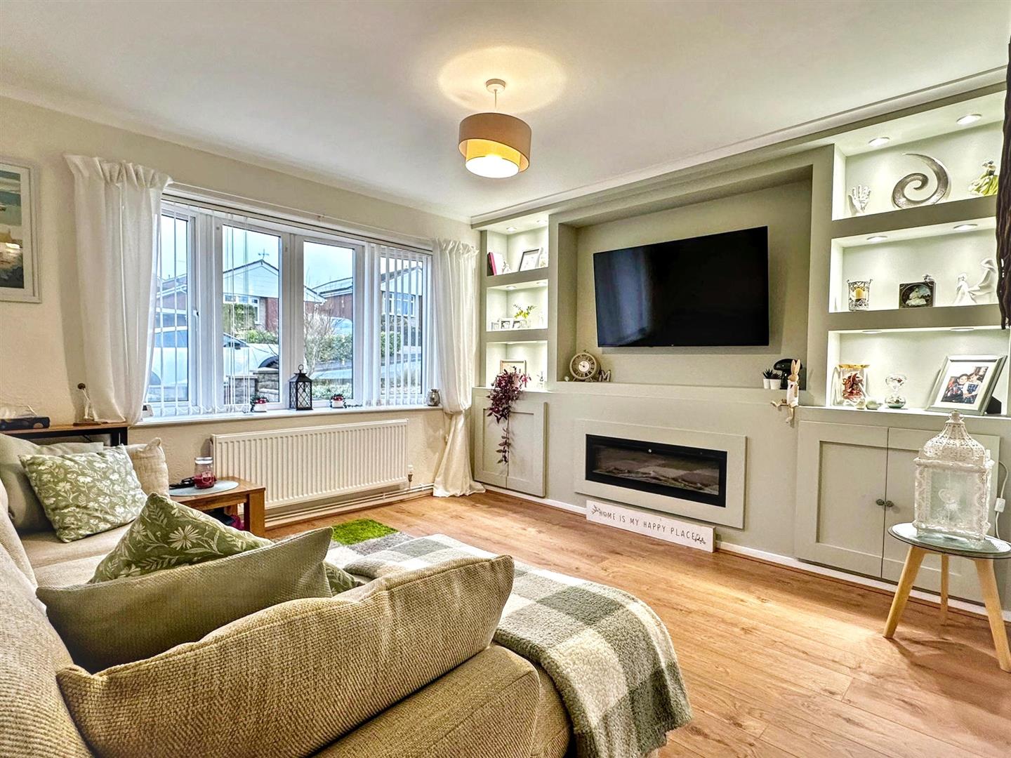 Internally, the accommodation is beautifully finished and well proportioned. The shaker-style kitchen is fitted with a range of integrated appliances and is decorated in warm neutral tones, enhanced by bespoke panelling.The living room is a standout feature of the home, offering generous space and boasting an impressive media wall with built-in shelving, ambient lighting and an electric fireplace, creating a cosy yet modern focal point.