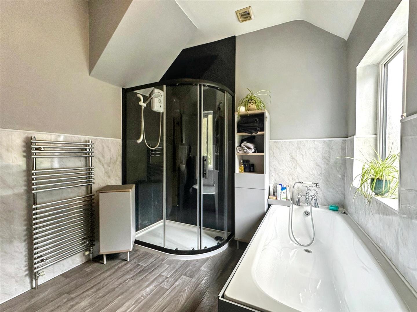 Vinyl flooring. Low-level WC. Vanity style wash handbasin. Heated towel rail. Bath. Shower attachment. Shower cubicle with electric shower. Obscured uPVC window. Ceiling light.