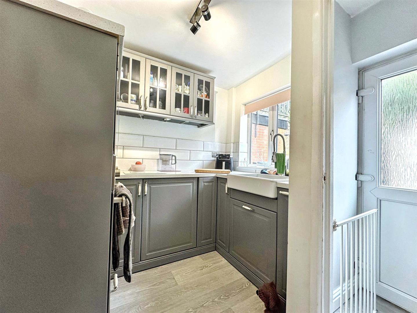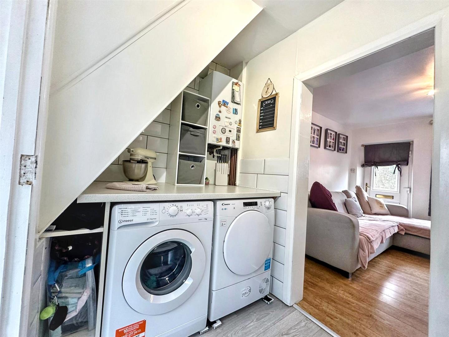 Continued laminate flooring. Door to the rear aspect. Stairs to the first floor accommodation.