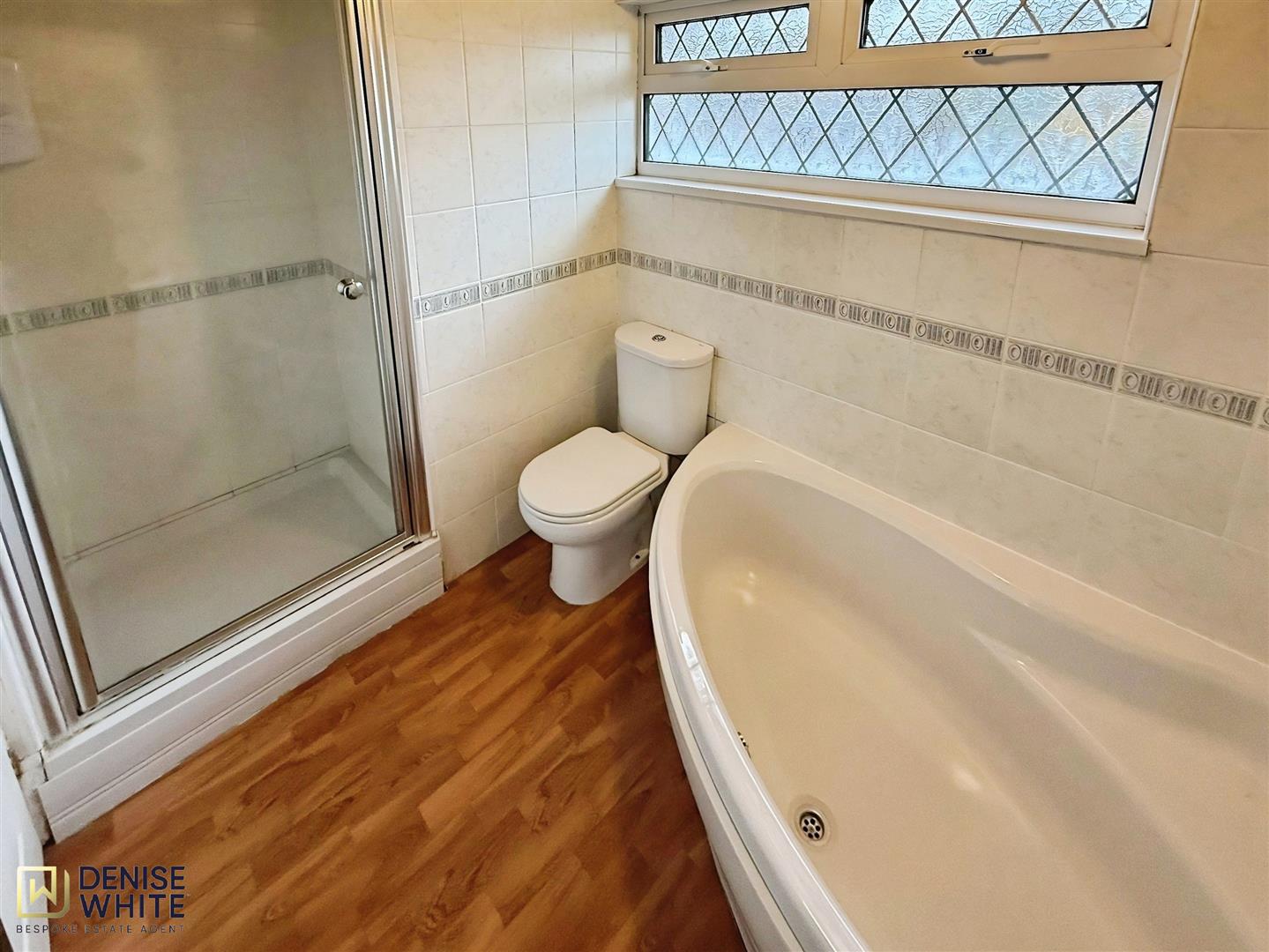 Laminate flooring. WC. Shower cubicle. Heated towel rail. Boiler access. Ceiling light.