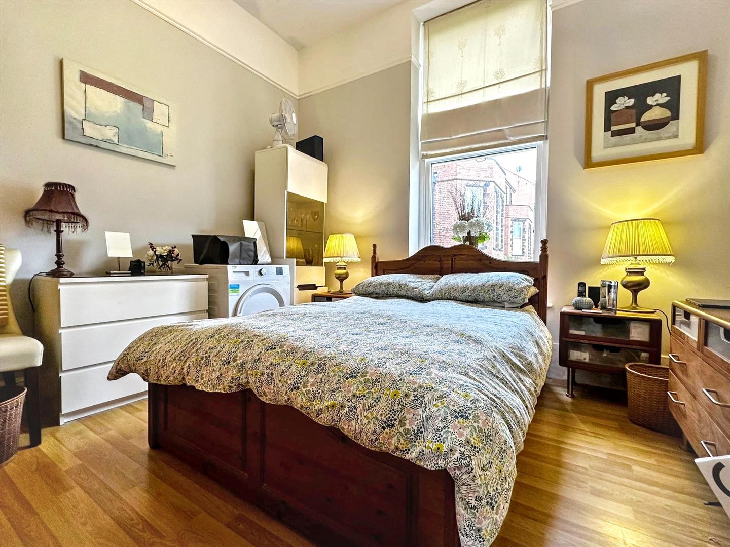 The kitchen is well laid out and perfectly positioned for day-to-day use with modern cabinetry. To the rear of the apartment, the standout feature is the impressive lounge — a spacious, light-filled room boasting high ceilings and two elegant sash windows that create a wonderful sense of volume and character. The combination of height, light, and period detailing gives this room a particularly warm and inviting atmosphere.