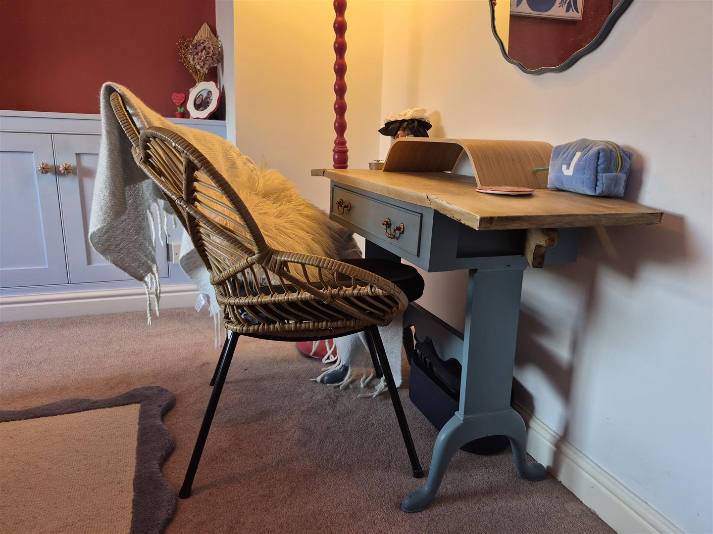 To the ground floor, an entrance hall provides access to two generous reception rooms. The lounge spans one side of the property and features a log-burning effect gas stove as its focal point, with French doors that open directly onto the rear garden. To the opposite side, the dining room boasts a characterful log-burning stove and flows beautifully into the hand-painted kitchen, which is fitted with integrated appliances and offers space for a freestanding range-style cooker.