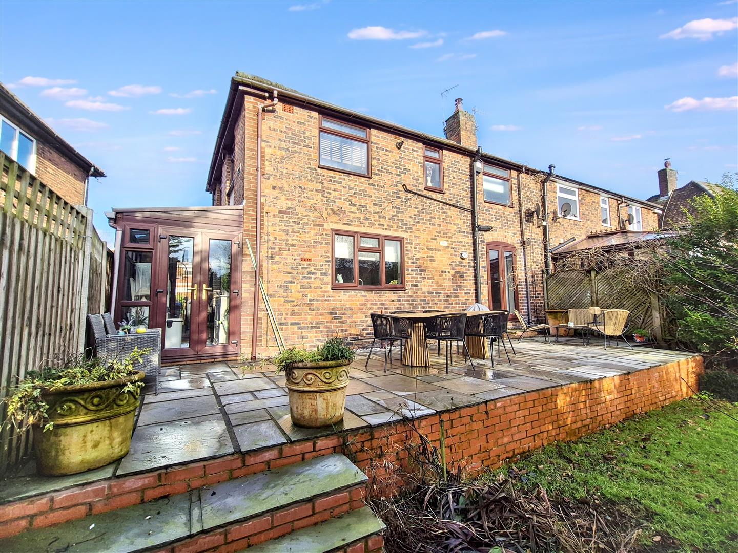 The property enjoys attractive gardens to both the front and rear. The rear garden features a raised patio seating area ideal for entertaining and al fresco dining, leading down to a private lawn bordered by mature trees and established shrubs, providing a high degree of privacy.